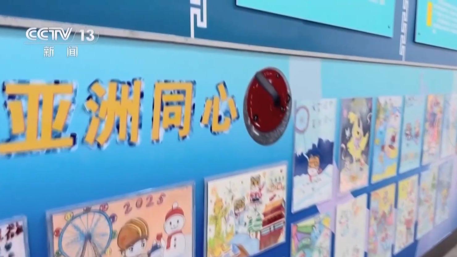 在亚冬会比赛期间,各国运动员们就会通过走廊前往比赛场地,两侧是这个小学的孩子们亲手绘制的亚冬会绘画作品。每一幅画都充满了冰雪运动的梦想与热情。