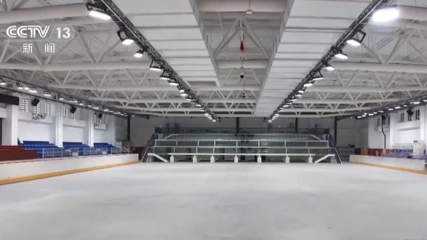 总台央视记者 郑怡哲:行走在冰壶比赛的冰面上,依然可以看到原来场馆的主体结构,但是冰壶馆的内部空间则是进行了全面的优化。