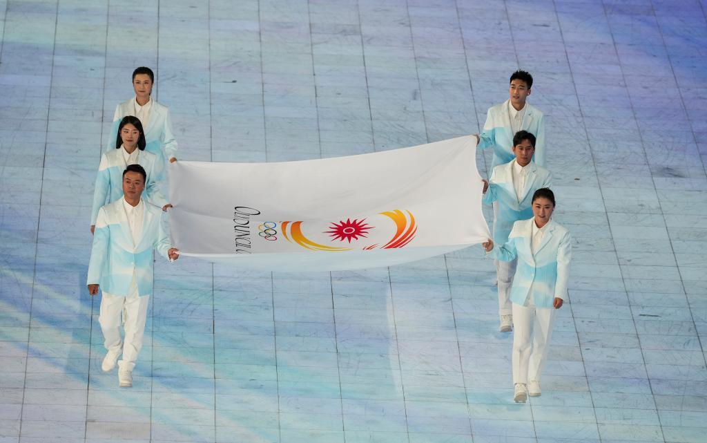 六名运动员代表共执亚奥理事会会旗入场。1996年,正是在哈尔滨,中国代表团首次在亚冬会实现金牌榜和奖牌榜“双居首”;29年后,哈尔滨成为中国首座“双亚冬之城”,中国冰雪运动正以更加自信的姿态步入舞台中央。