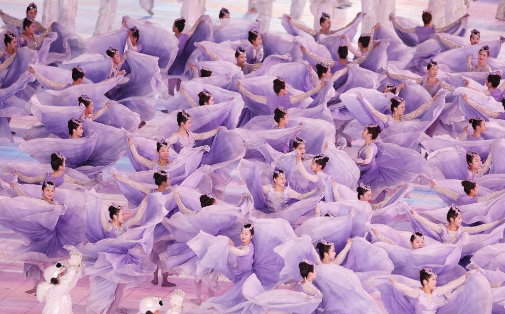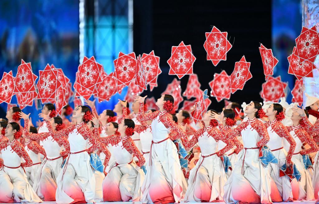 一面冰雪,一面新春。身着中式旗袍的舞者登场,她们手持的双色“冰凌手绢花”尽显巧思。在张灯结彩的龙江雪乡,从“冰晶蓝”到“中国红”,从“冰世界”到“雪天下”,双色“冰凌手绢花”上下翻腾。舞者时而排列为一朵“六出雪花”,时而汇聚成一张“新春窗花”。东道主用民间极具代表性的“手绢花舞”和浓浓的中国年味,喜迎各代表团运动员入场。