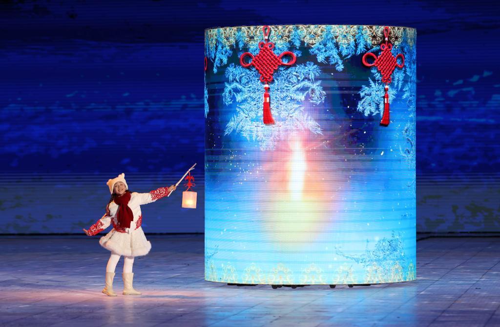 一盏冰灯,一个梦想。冰灯是哈尔滨的文化符号,冰城人童年记忆里跃动的光亮。一名小女孩手提盈盈微光的小冰灯,引亮舞台中央的大冰灯,开启了以“启梦”为主题的迎宾表演。34名孩童手提小冰灯围合环抱,象征着本届亚冬会34个参赛国家和地区凝心聚力,点亮冰雪梦想。