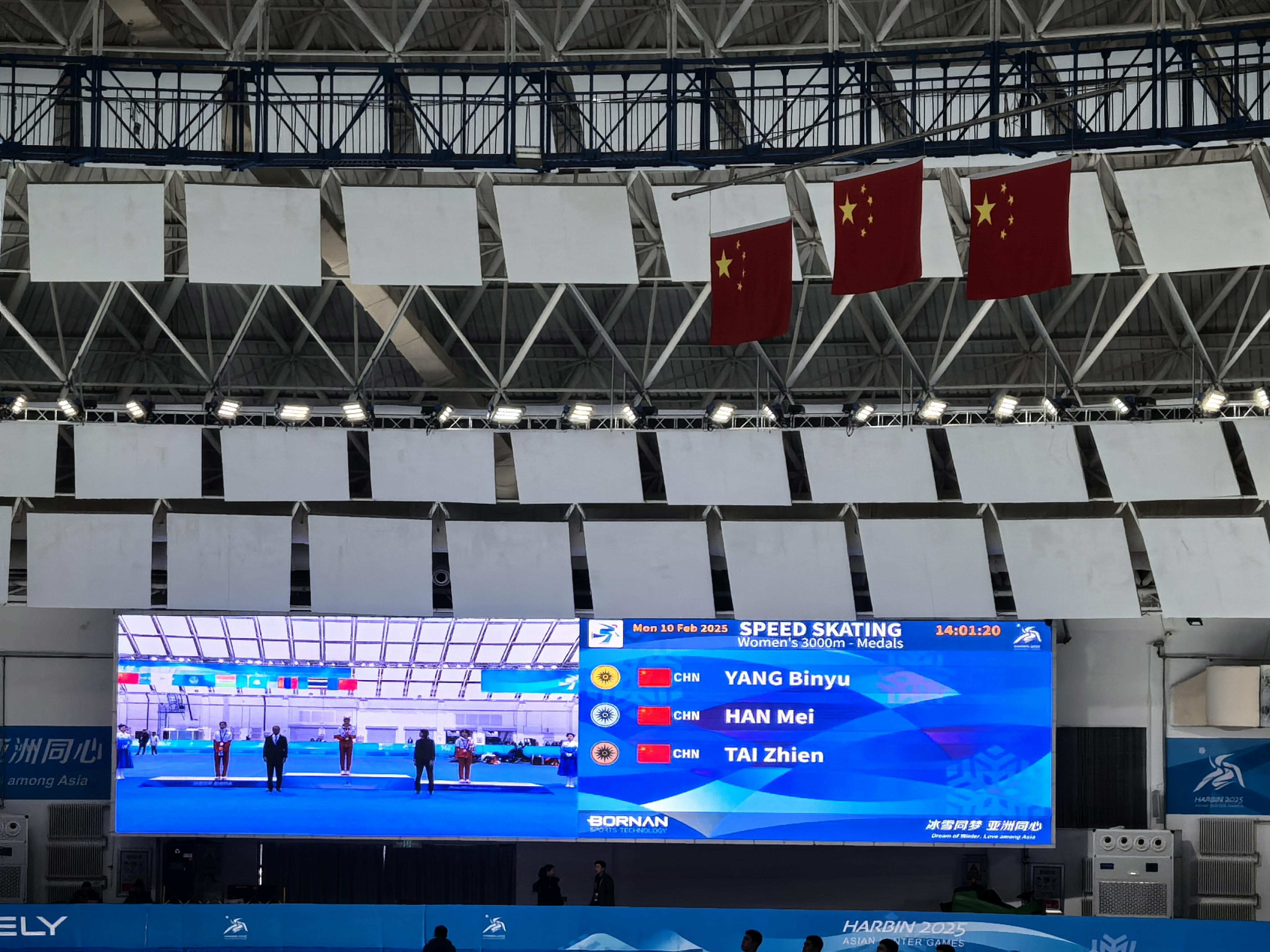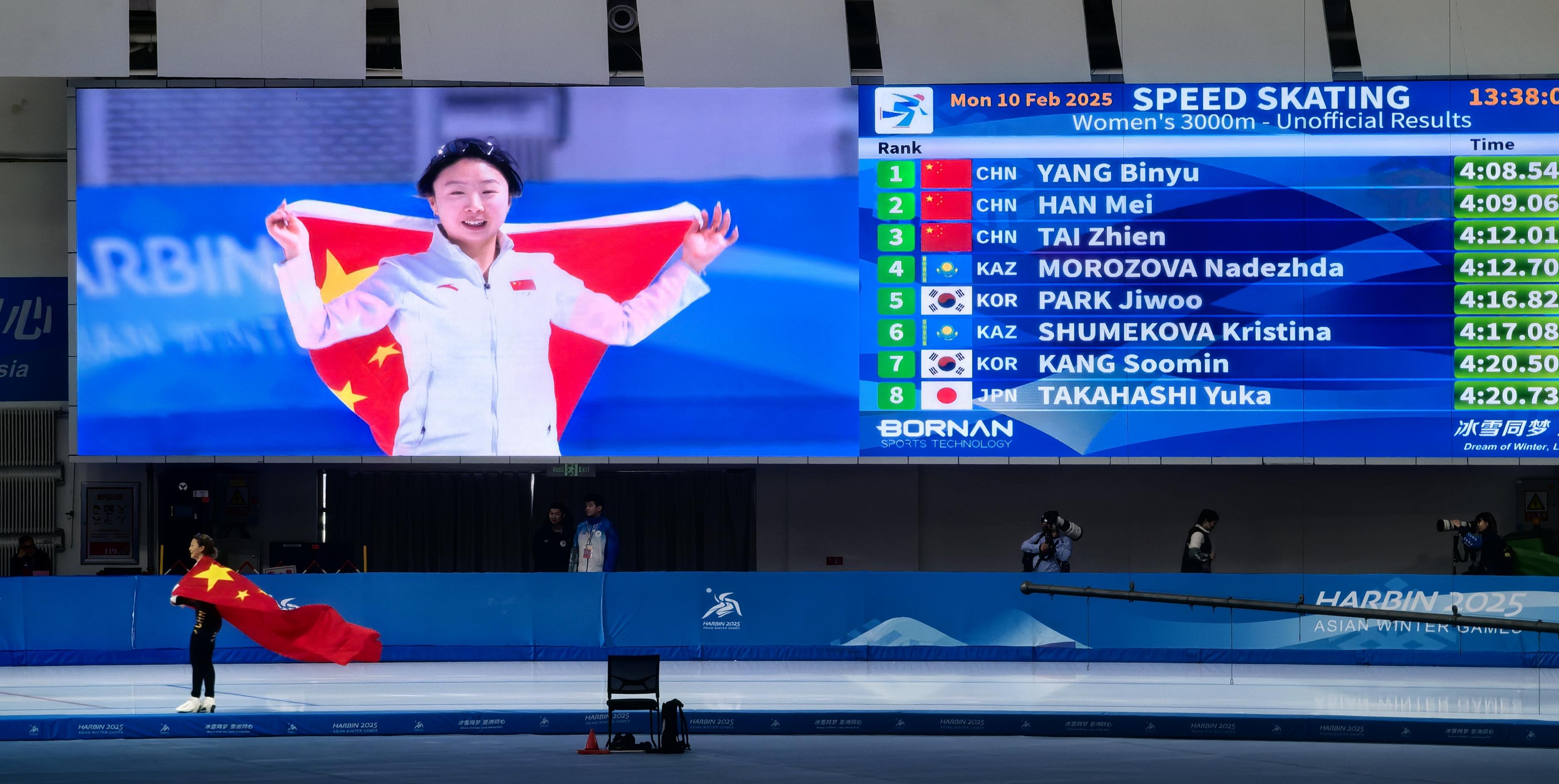在2月10日举行的哈尔滨2025年第九届亚冬会速度滑冰女子3000米比赛中,中国选手包揽了此项比赛的奖牌。其中,中国队选手杨滨瑜夺得金牌,韩梅摘取银牌,太智恩摘取铜牌。这是中国体育代表团在本届亚冬会上收获的第20枚金牌。