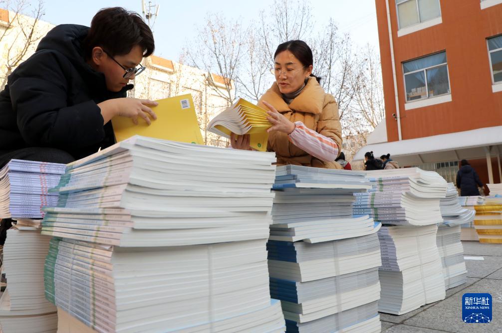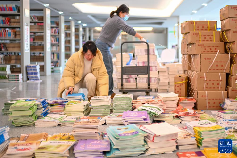 2月10日,山东省滨州市博兴县第一小学教师在清点新学期教材。