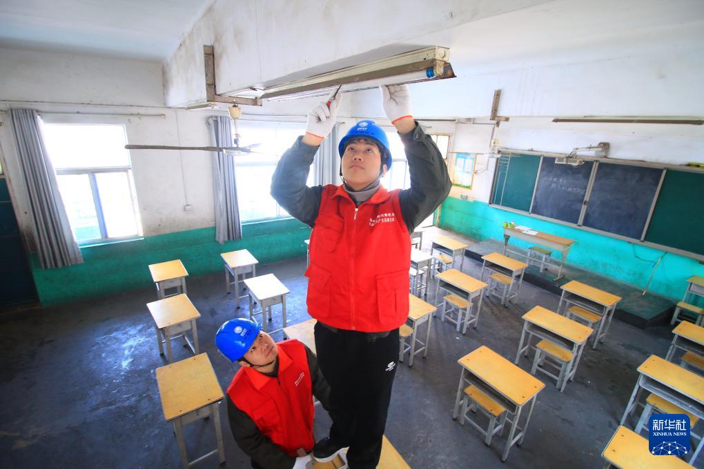 2月10日,在河南省洛阳市汝阳县小店镇马庄村小学,供电公司工作人员检查教室用电线路。