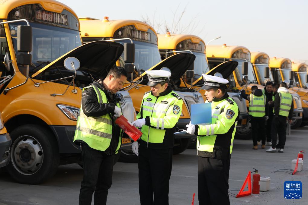 2月10日,河南省洛阳市汝阳县公安局交通警察大队交通民警对校车进行安全检查。