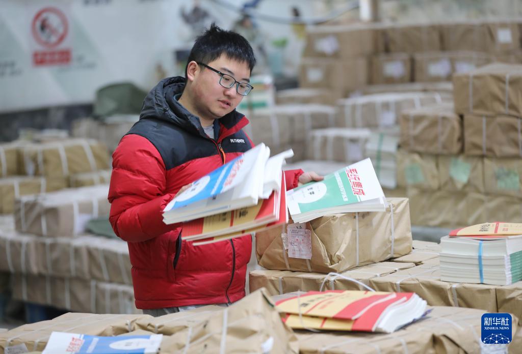 2月10日,在湖南省永州市道县新华书店仓库,工作人员在清点、分发教材。