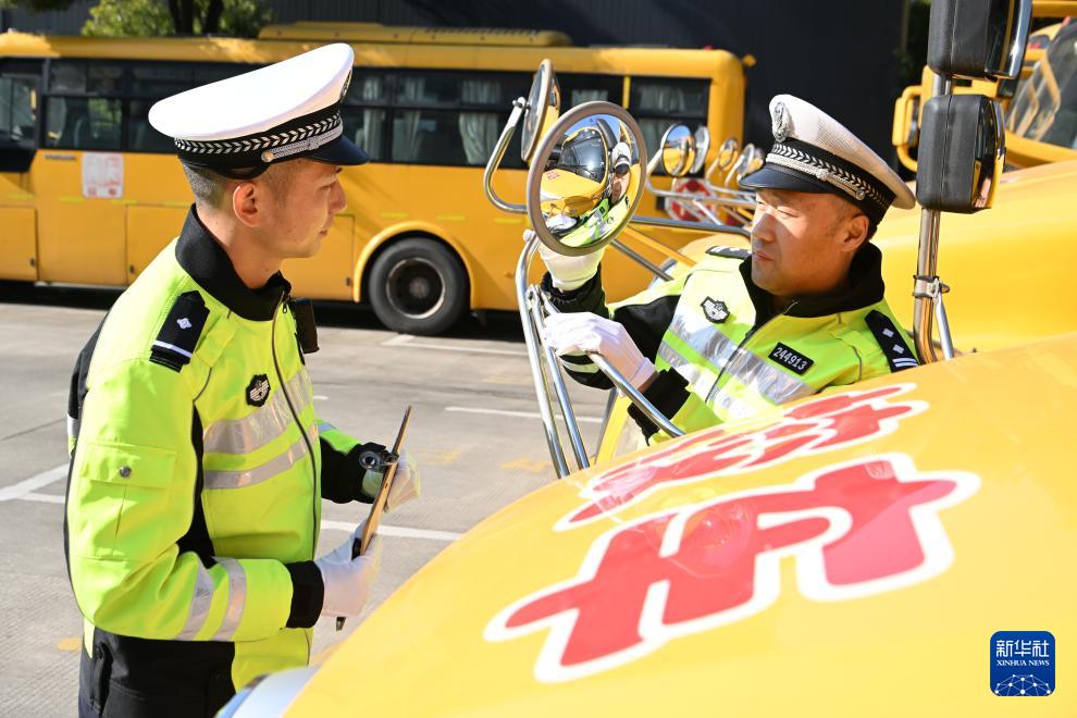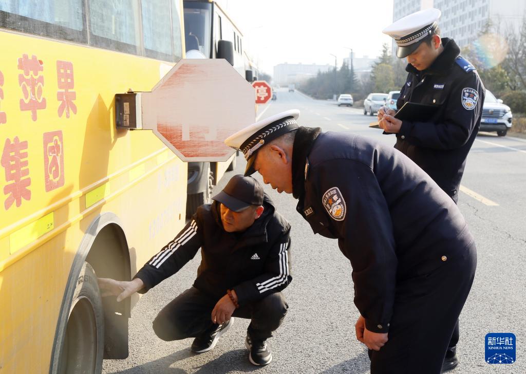 2月10日,江苏省太仓市交警大队交警对校车后视镜进行检查。
