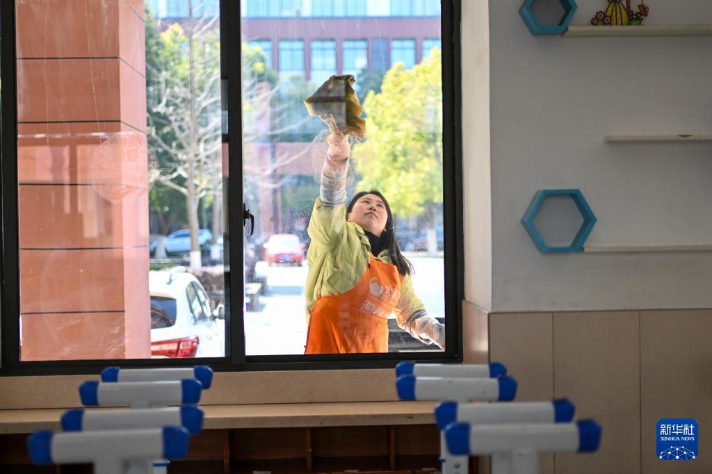 2月10日,一名家长志愿者在江苏省昆山开发区青阳港学校擦拭教室窗户。