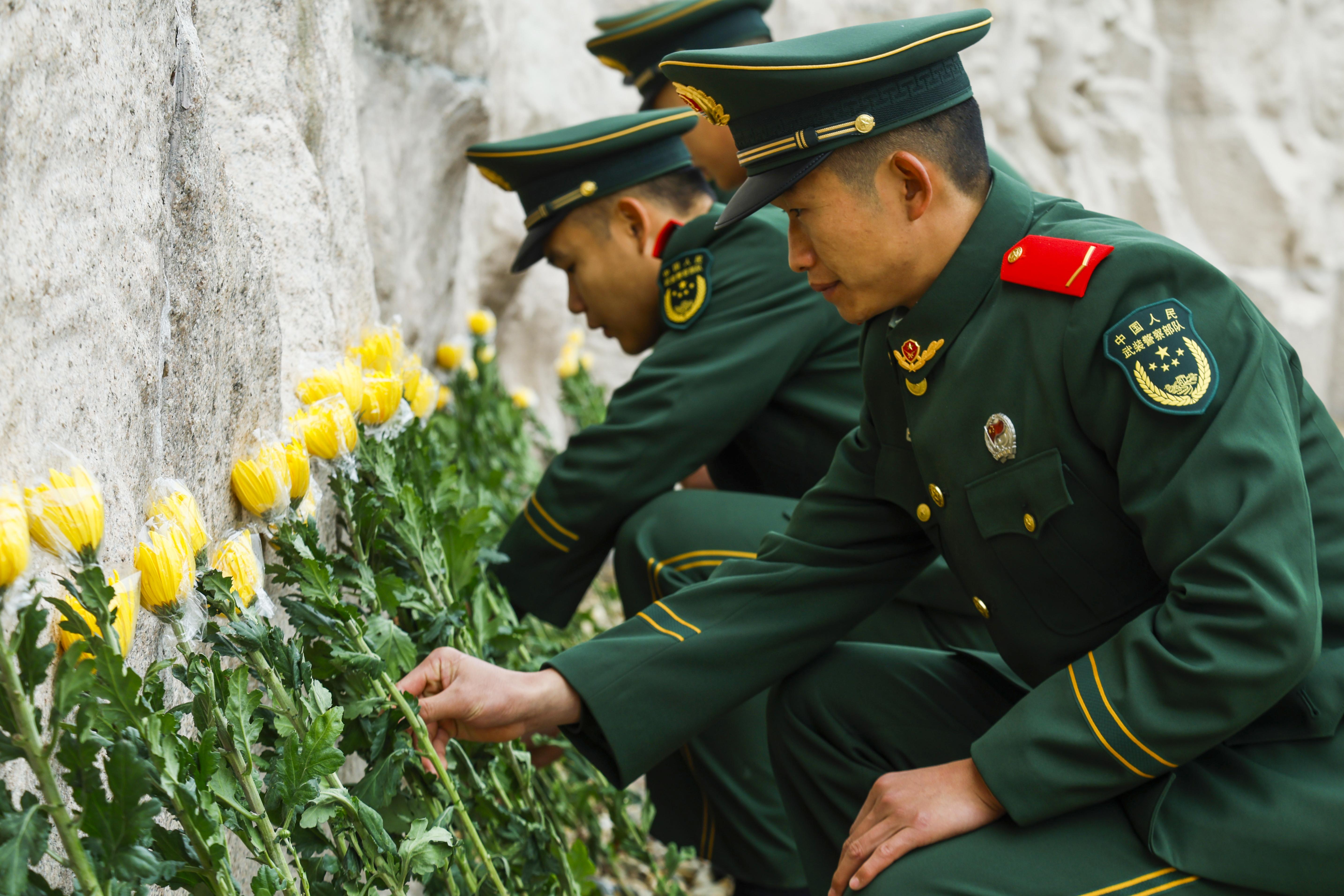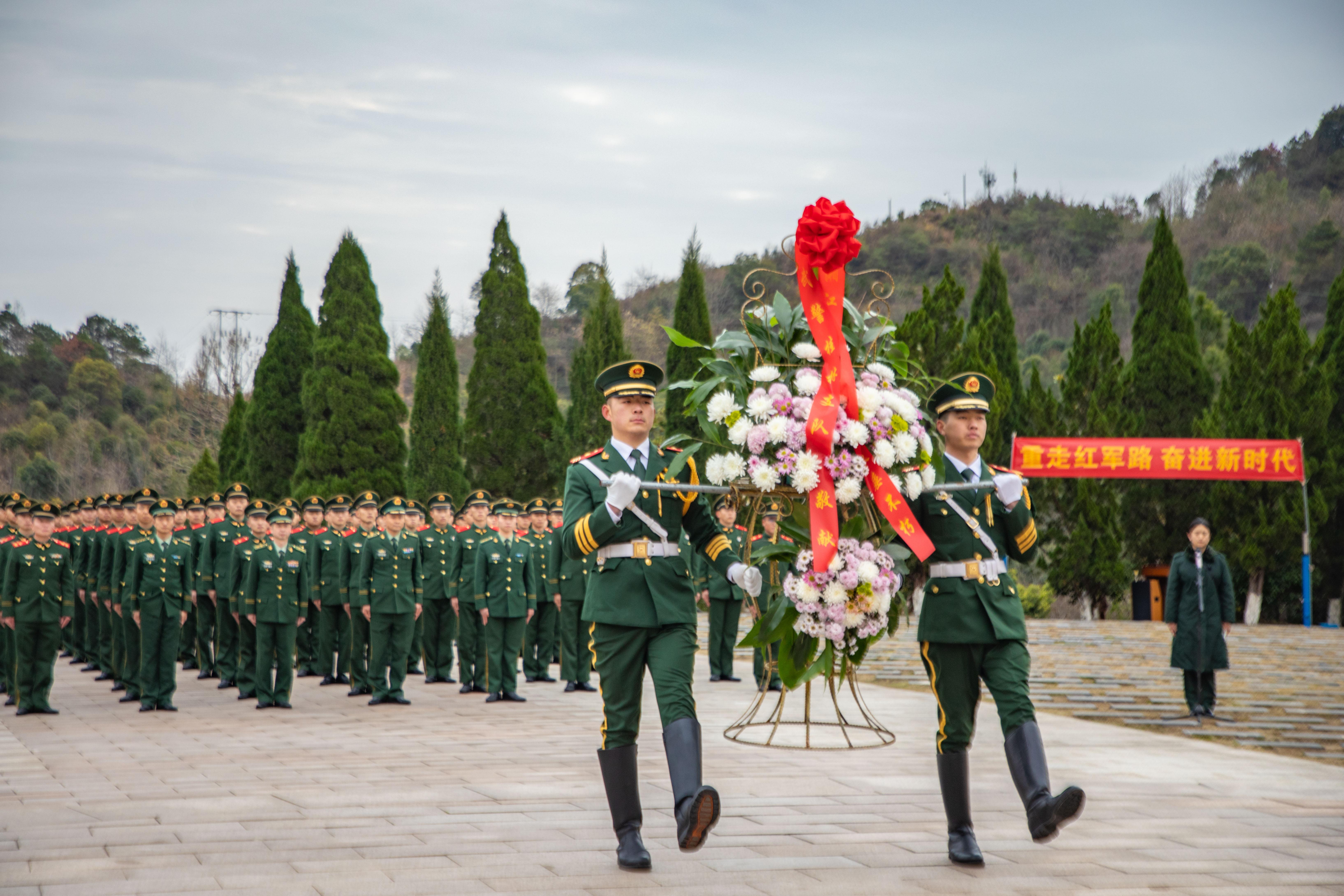 在桂林市全州县的红军长征湘江战役纪念园内,全体官兵庄严肃立,怀着崇敬之情向革命烈士敬献花篮。