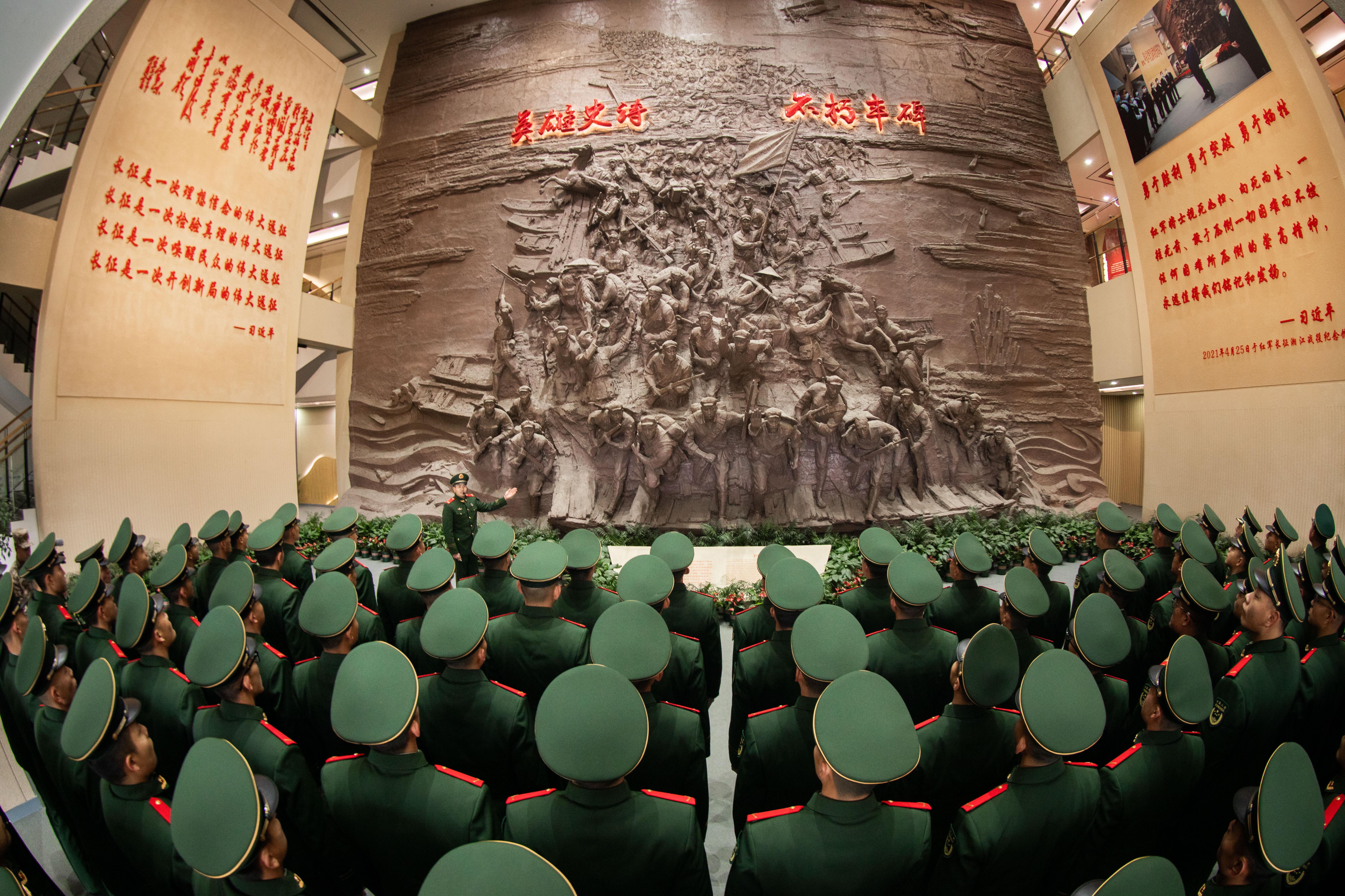 仪式结束后,在讲解员的引领下,官兵们走进红军长征湘江战役纪念馆。展区以“英雄史诗,不朽丰碑”为主题,展示了从苏区创建到湘江战役、遵义会议、长征胜利会师,再到新中国成立后各个历史时期所取得的辉煌成就。新兵们的目光被一件件带着岁月痕迹的珍贵实物、一幅幅记录历史瞬间的图片牢牢吸引。