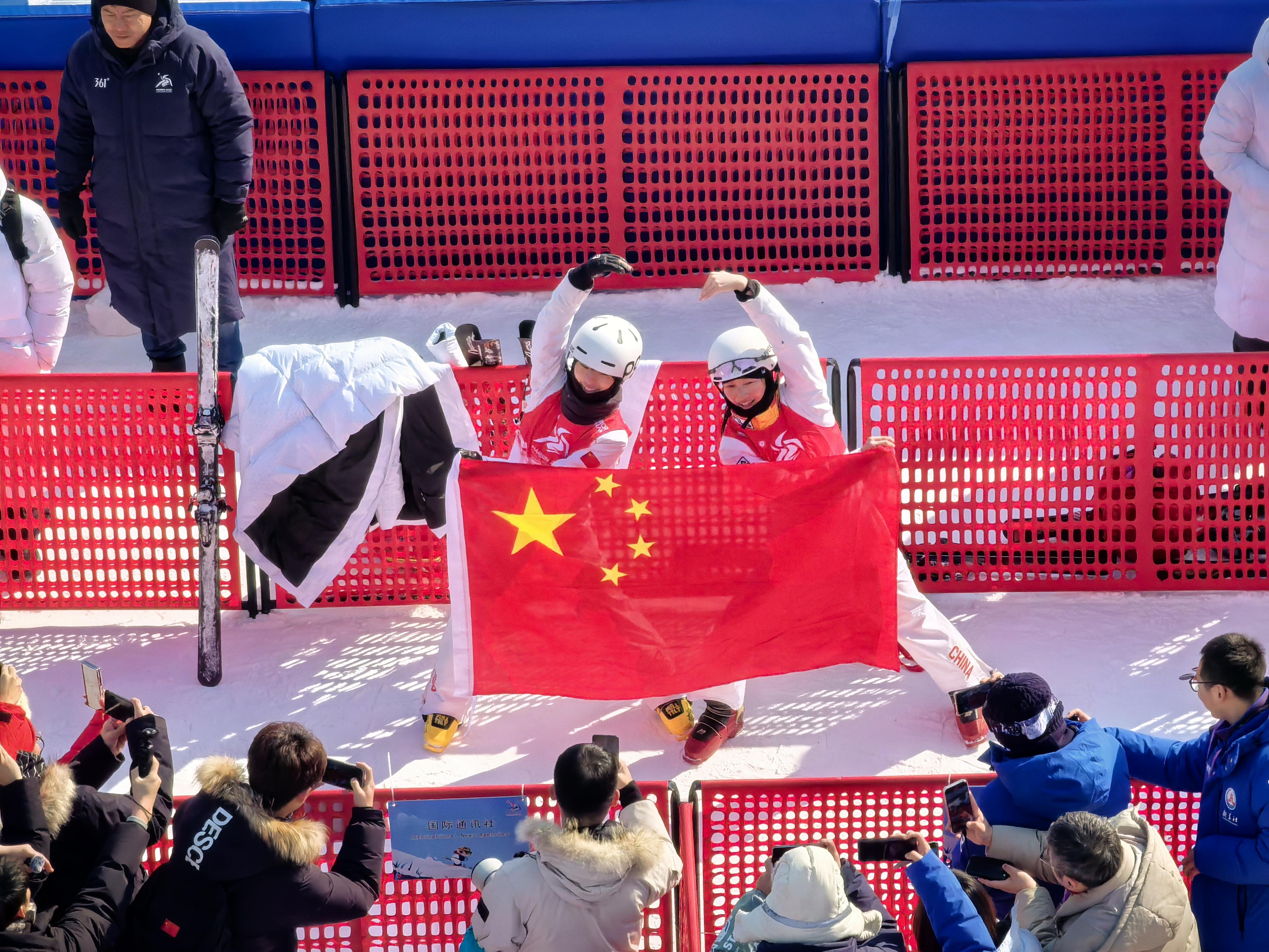 2月11日中午,在哈尔滨亚冬会自由式滑雪女子空中技巧双人同步决赛中,中国队组合冯俊熙/王雪夺得金牌,陈梅婷/徐梦桃获得银牌。这是中国代表团在本届亚冬会上获得的第22枚金牌,也是该项目的亚冬会首金。
