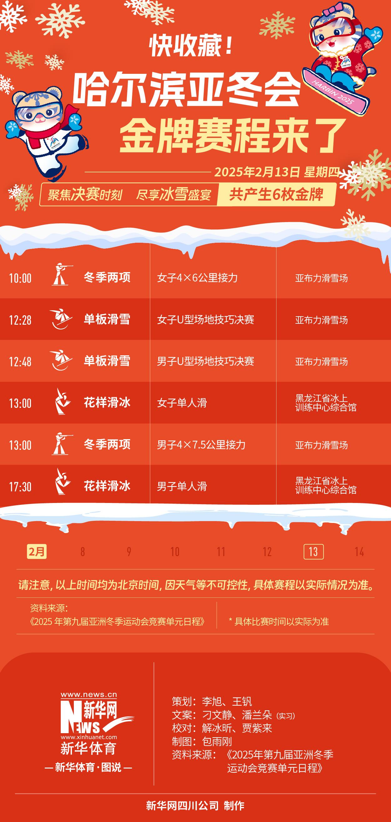 哈尔滨亚冬会13日将产生6块金牌。在亚布力赛区,单板滑雪U型场地技巧和冬季两项接力赛将为雪上项目画上句号。冰上方面,花样滑冰将迎来男单、女单自由滑比赛。