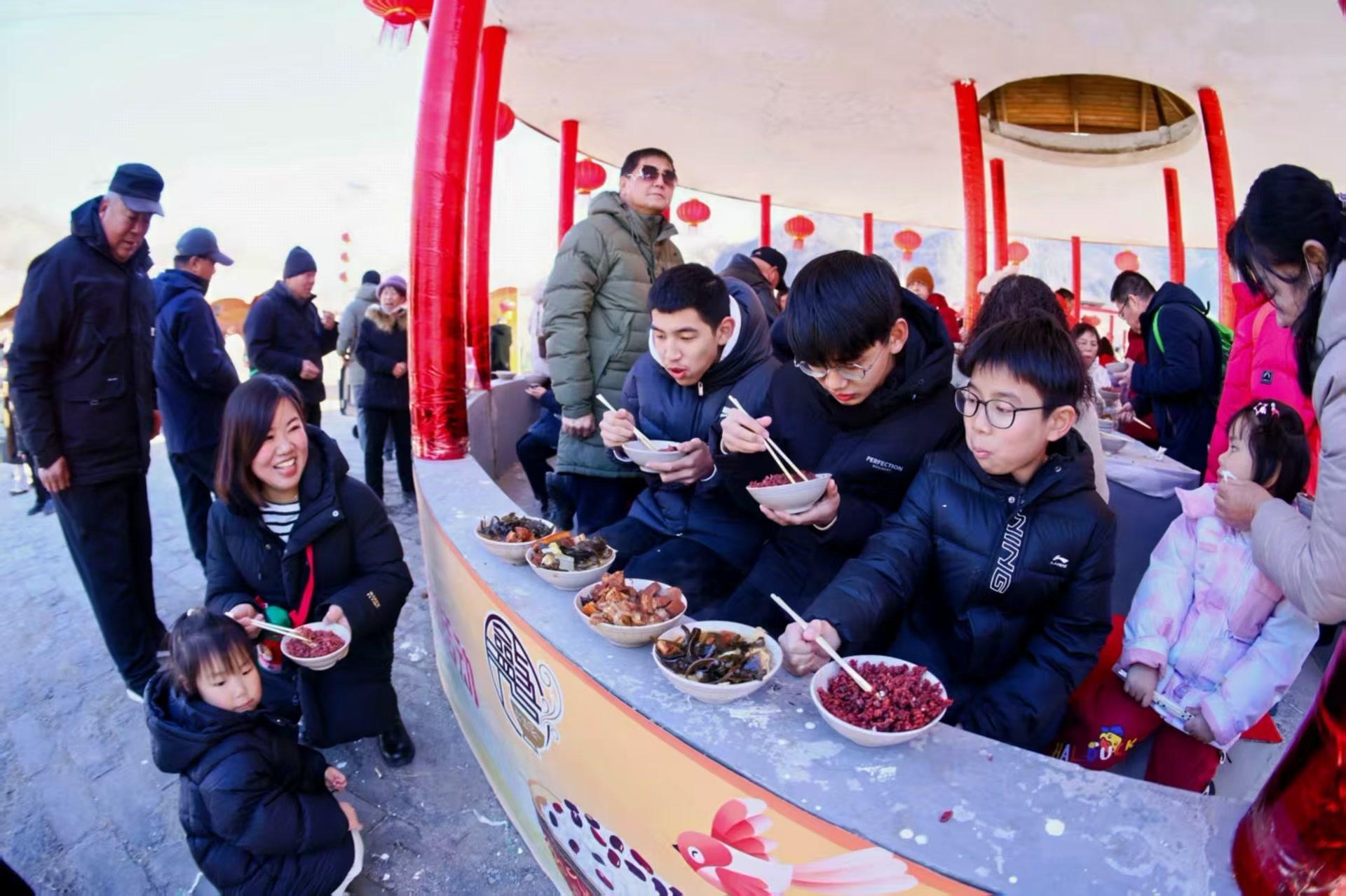 当天一大早,活动主会场杨树底下村便热闹起来。按照传统习俗,村民们挨家挨户“敛收”各种食材,汇聚百家之福,共同烹制“敛巧饭”。中午时分,热气腾腾的“敛巧饭”出锅,市民游客和村民们围坐在一起品尝美味,感受浓浓的年味和乡情。