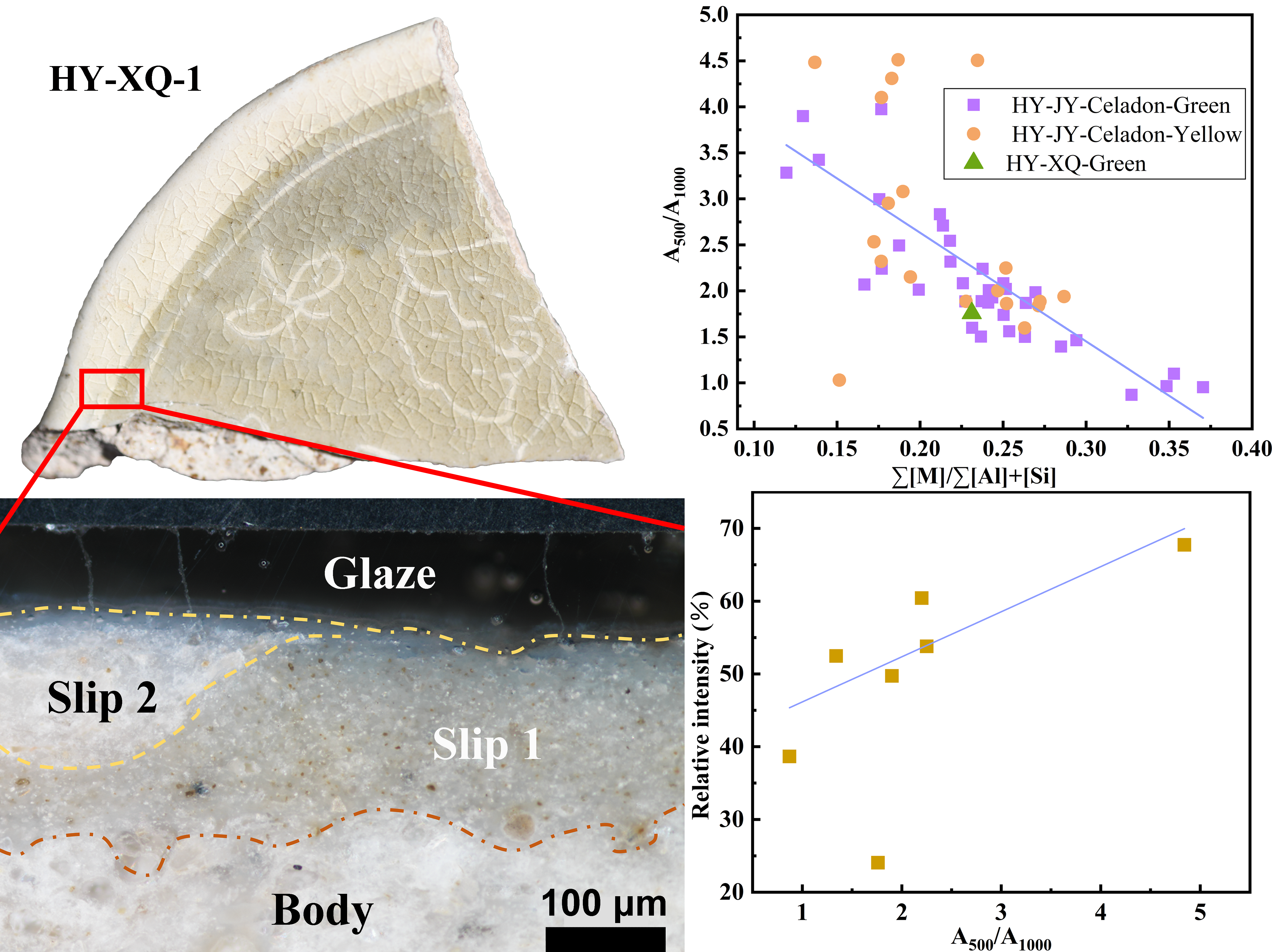 不仅如此,该研究还利用拉曼光谱和X射线衍射技术分析研究镶嵌青瓷和普通青瓷。研究发现,随着改性氧化物含量的增加,釉层的玻璃相无序结构得到增强。这一发现为科学家们提供了更好的手段来破译陶瓷釉中的非晶结构,从而进一步理解釉料的色彩机制和制作工艺。