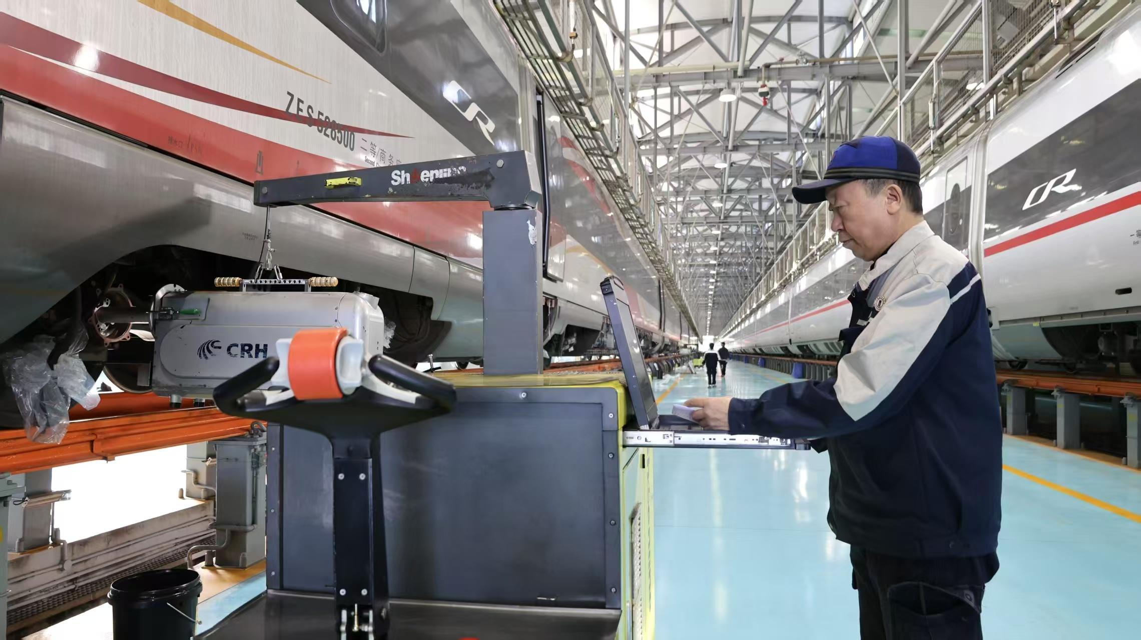 2月12日9时15分,在广东省广州市番禺区的广州南动车运用所检修库内,探伤工冯佳伟正操作探伤机,对动车组转向架的空心轴进行超声波探伤。