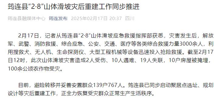 2月17日,记者从四川宜宾筠连县“2·8”山体滑坡应急救援指挥部获悉,灾害发生后,解放军、武警、消防救援、综合应急、公安、交通、医疗等各类综合救援力量3000余人,利用搜救犬、无人机、生命探测仪、大型工程机械等设备迅速投入抢险救援。截至2月17日12时,此次山体滑坡灾害造成2人受伤、10人遇难、19人失联,10户房屋被掩埋,100余公顷农作物受灾。