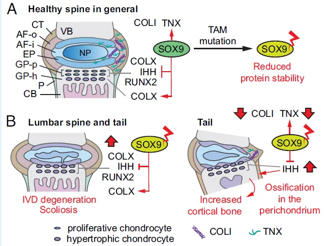 为证实这一猜想,团队构建了同样变异的小鼠模型。结果显示,携带TAM结构域突变的小鼠在出生时骨骼正常,但成长的过程中逐渐出现尾巴弯曲、胸廓异常、脊柱侧凸,成年后43%自发形成脊柱侧弯,与人类“弯肢发育不良综合征”症状一致。研究人员表示,这提示TAM结构域中的SOX9基因突变不仅导致广泛的骨骼发育不良,也可导致中轴骨的骨骼畸形,这也解释了部分患者幼年没有症状、青春期骨骼快速生长时才发病的情况。