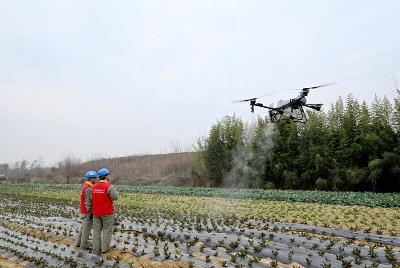 春耕时节要早播早种,及时施肥除虫害。隔蒲潭镇有“湖北蔬菜第一镇、武汉‘菜园子’”的美誉,蔬菜种植总面积近8万亩,眼下蔬菜均已进入播种、育苗状态。抢抓农时、春管备耕,科技手段成农户杀虫施肥“新利器”。装料、起飞、喷洒,在马贵德的蔬菜地里,云梦县供电公司隔蒲供电所调配1台多用途无人机为蔬菜种植施肥、除虫,运维人员沈东扬操作操纵杆,装满农药的无人机从地面垂直起飞,按照既定路径在田间盘旋,农药便均匀洒在田间。