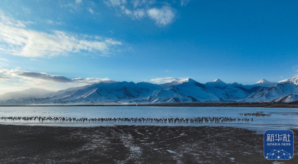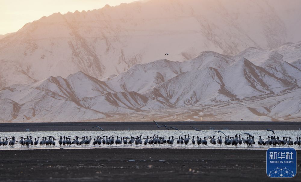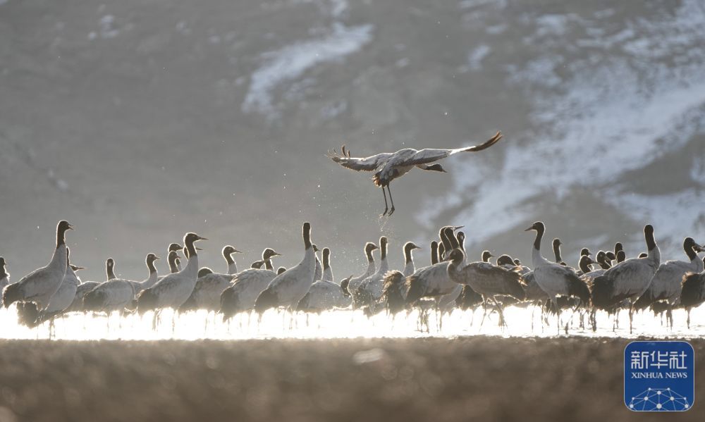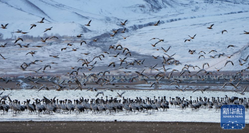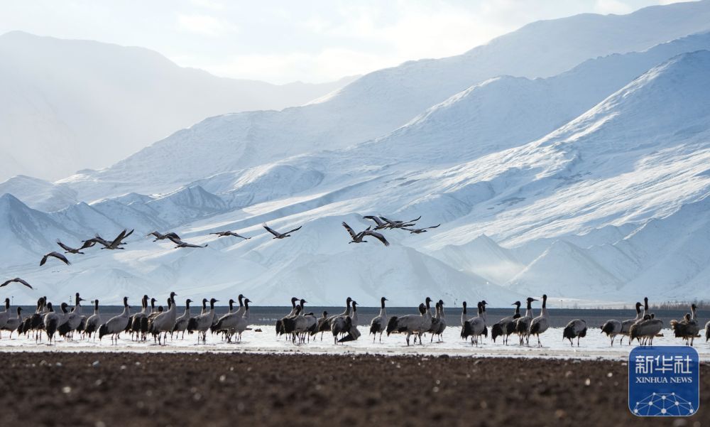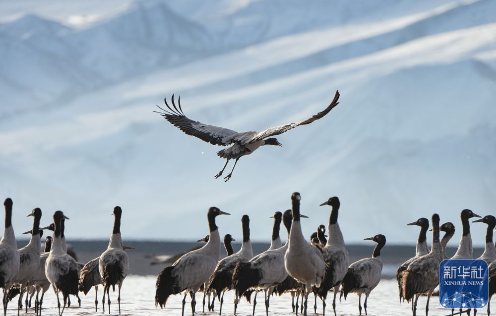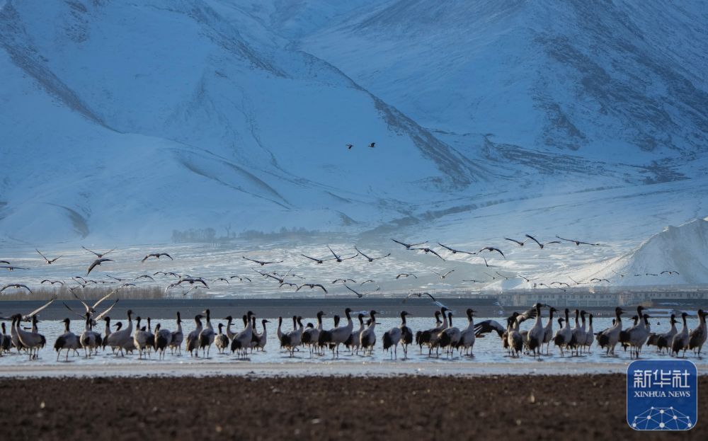 西藏自治区拉萨市林周县平均海拔约4200米,是黑颈鹤的主要越冬地之一。一场冬雪,将林周县虎头山水库染成一片银白,黑颈鹤仿佛是这洁白舞台优雅的舞者。