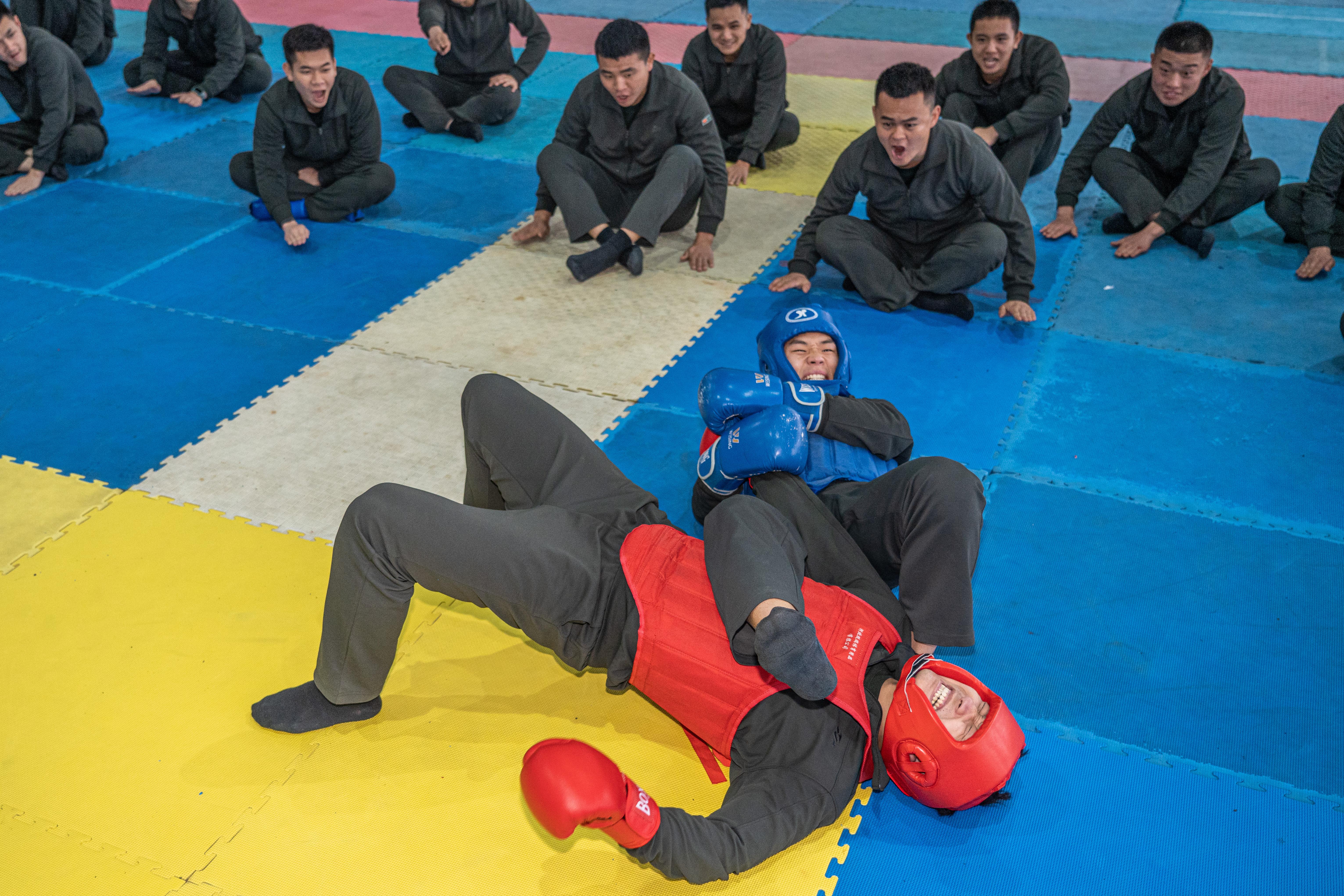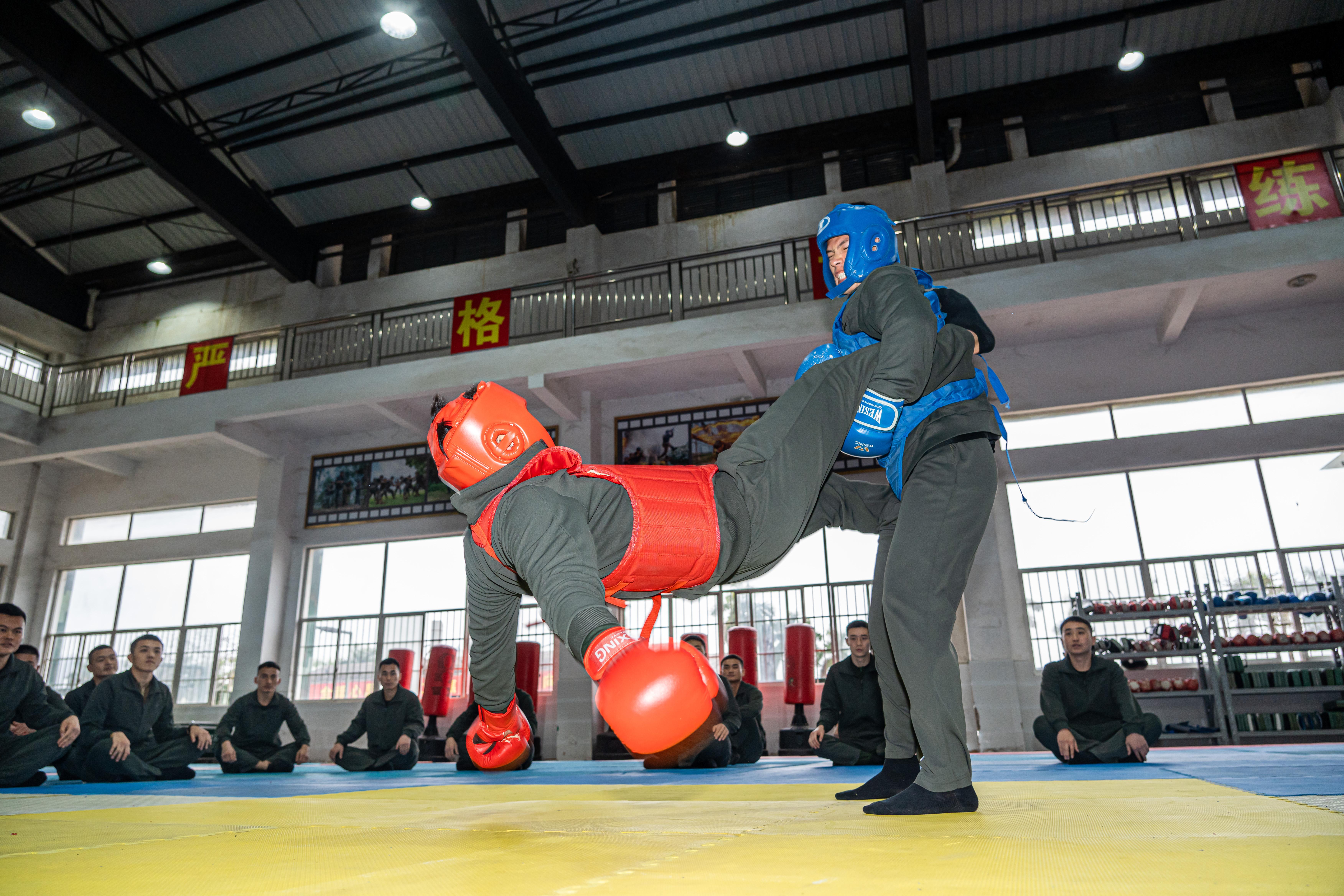 集训立足实战需求科学设置课程内容,在系统强化直拳、摆拳、格挡等基础动作规范性的同时,重点围绕抓捕控制、多人对抗等任务场景展开应用训练。教学组将拳腿技法与摔锁控制融入战术背景,设计多组带有实战想定的对抗演练,官兵需在模拟复杂环境中完成技术动作衔接与临机处置。针对以往训练中暴露的组训方法单一、纠错能力薄弱等问题,集训特别增设教学法研练环节,要求参训骨干轮流担任模拟教员,从动作分解示范到训练安全管控进行全流程实操。来自某部的军内拳击教员带来移动靶攻防、组合连击节奏控制等特色课程,通过现场拆解动作要领、分析常见训练误区,帮助官兵深化对技战术的理解。