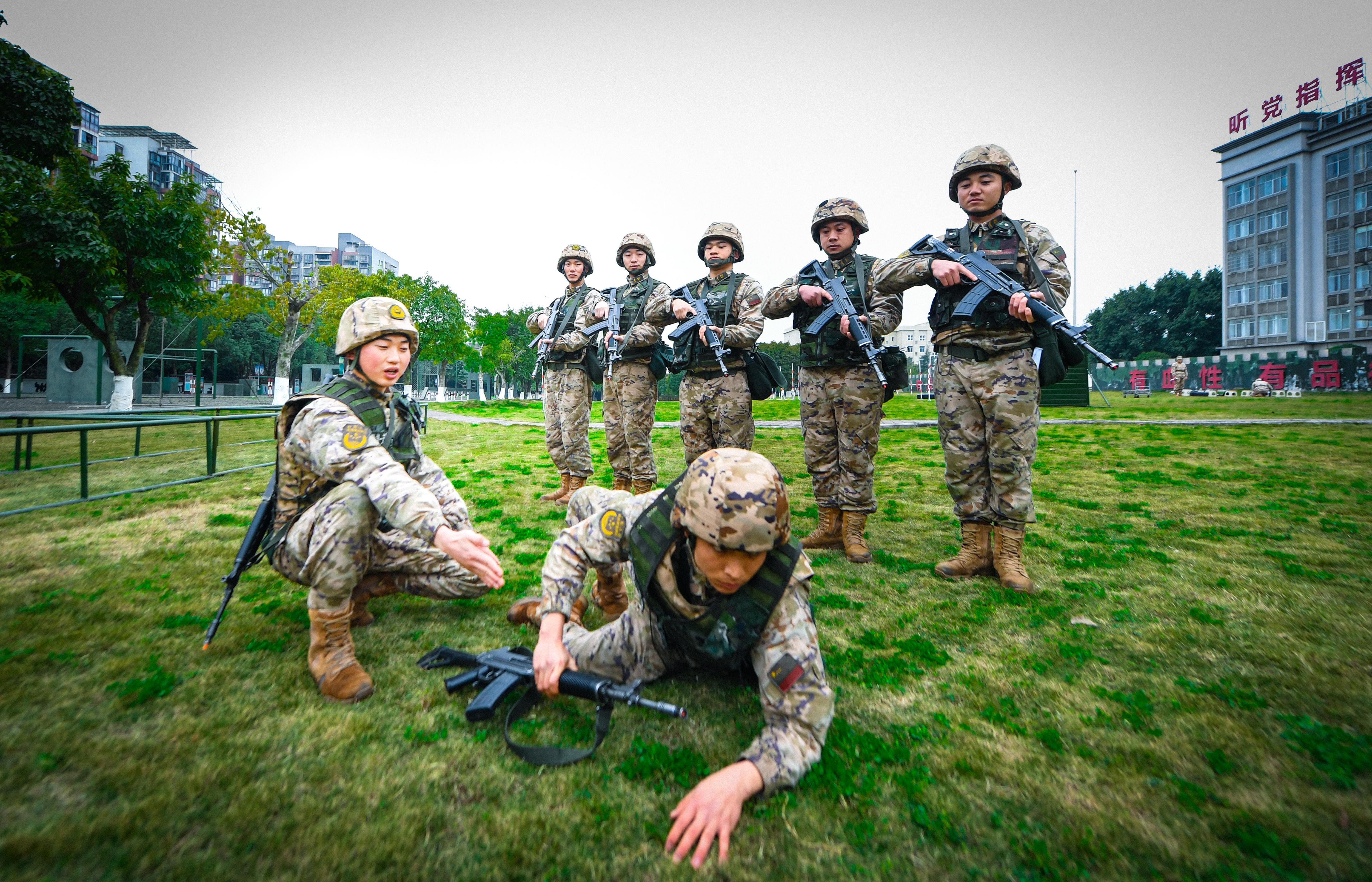 掩体构筑与伪装和战术训练区域,尘土飞扬。参训官兵身着厚重的战斗装具,在模拟战场上低姿匍匐、侧身跃进,快速构筑障碍物。“战场上,时间就是生命,每快一秒,就多一分胜算。”排长殷良在现场激励着大家。