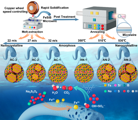 研究团队从2018年开始,对可控制冷却速率的熔体抽拉制备合金纤维技术进行系列研究。在最新研究成果中,研发团队利用该技术构建并定制了具有纳米晶/非晶异质结构的新型铸态非晶合金纤维催化剂,并提供了一种新型高级氧化催化剂以进行高效稳定的废水处理。基于这种方法得到的合金纤维,具有优异的催化活性和稳定性,与等温退火处理的脆性合金纤维相比,可在60秒内完全降解高浓度有机污染物罗丹明B,且具有约40次的强大复用性。