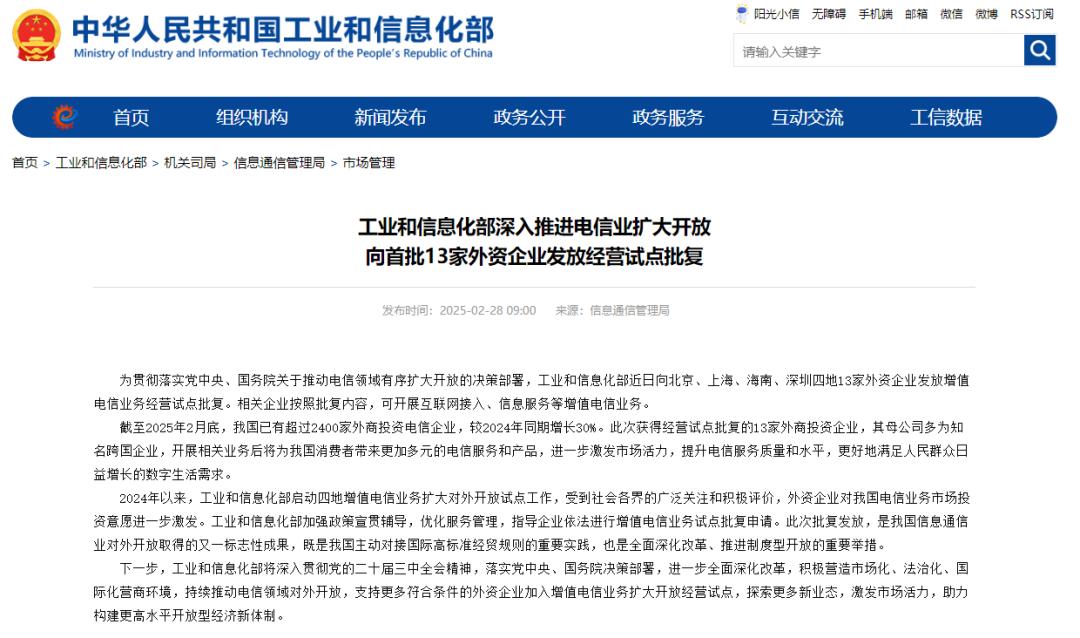 记者2月28日从工业和信息化部获悉,工业和信息化部近日向北京、上海、海南、深圳四地13家外资企业发放增值电信业务经营试点批复。相关企业按照批复内容,可开展互联网接入、信息服务等增值电信业务。