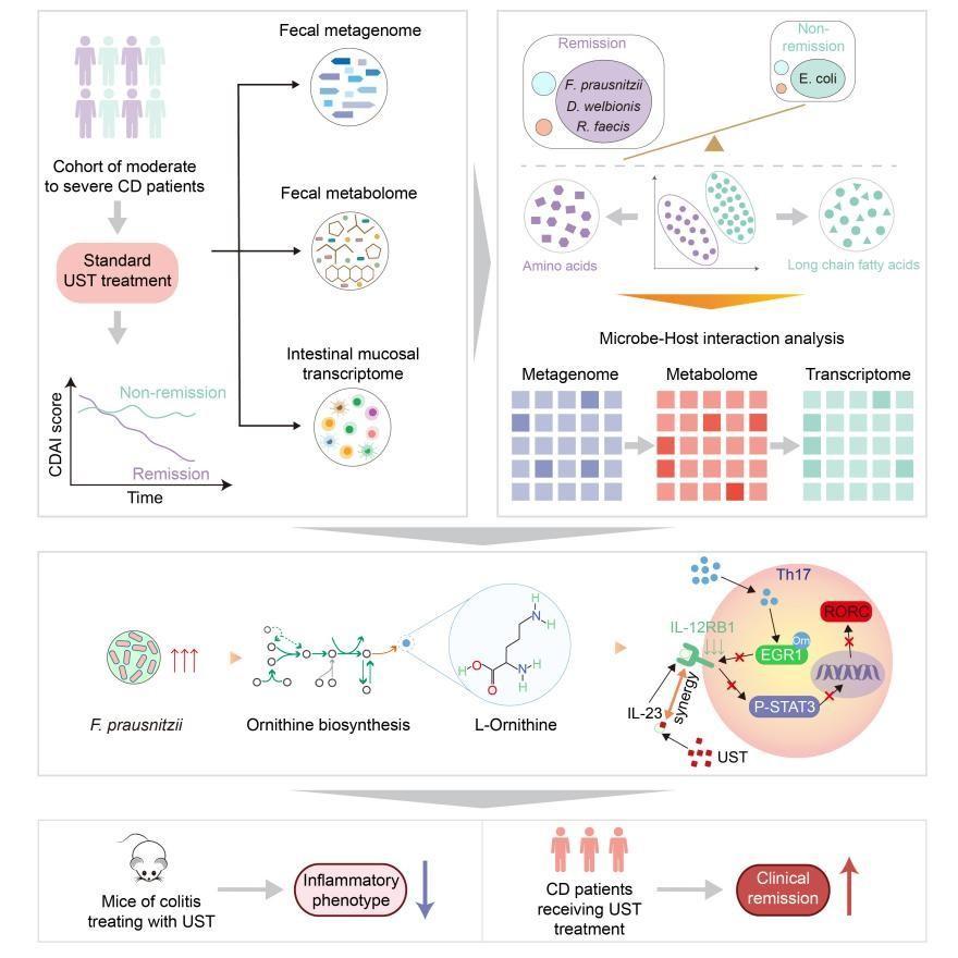上海交通大学医学院附属仁济医院消化科研究员洪洁团队及合作者首次阐明,以普拉梭菌为代表的肠道微生物驱动的L-鸟氨酸生物合成可显著增强乌司奴单抗的临床疗效,为克罗恩病的治疗提供了新的生物标志物,也开辟了乌司奴单抗联合用药治疗的新方向。日前,相关研究发表于《细胞代谢》。