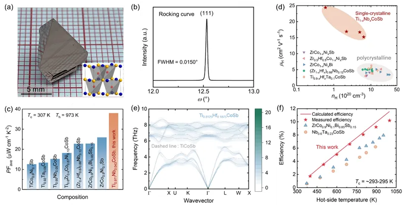 据此,科研团队利用优化后的TiCoSb基单晶,成功制备出半哈斯勒单腿热电器件,其能量转换效率峰值约10.2%。