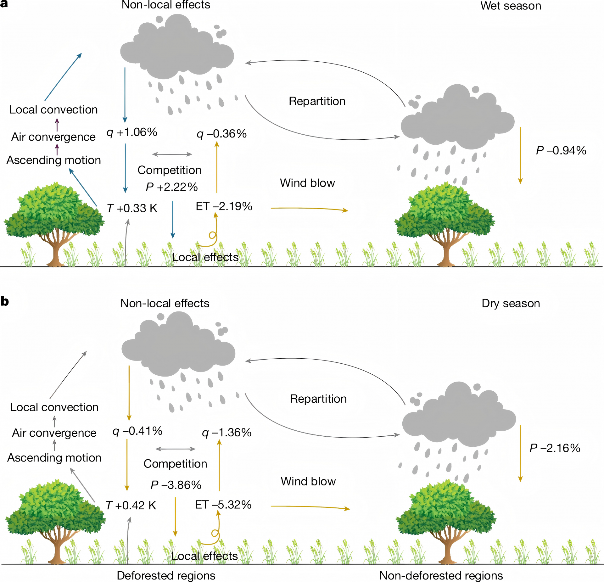 科研团队通过升级气候模型并创新水汽追踪技术,发现亚马孙森林在雨季时森林破坏会加强大气水汽输送,导致降水增加2.2%;旱季则因地表水分蒸发减少,使降水下降3.9%。