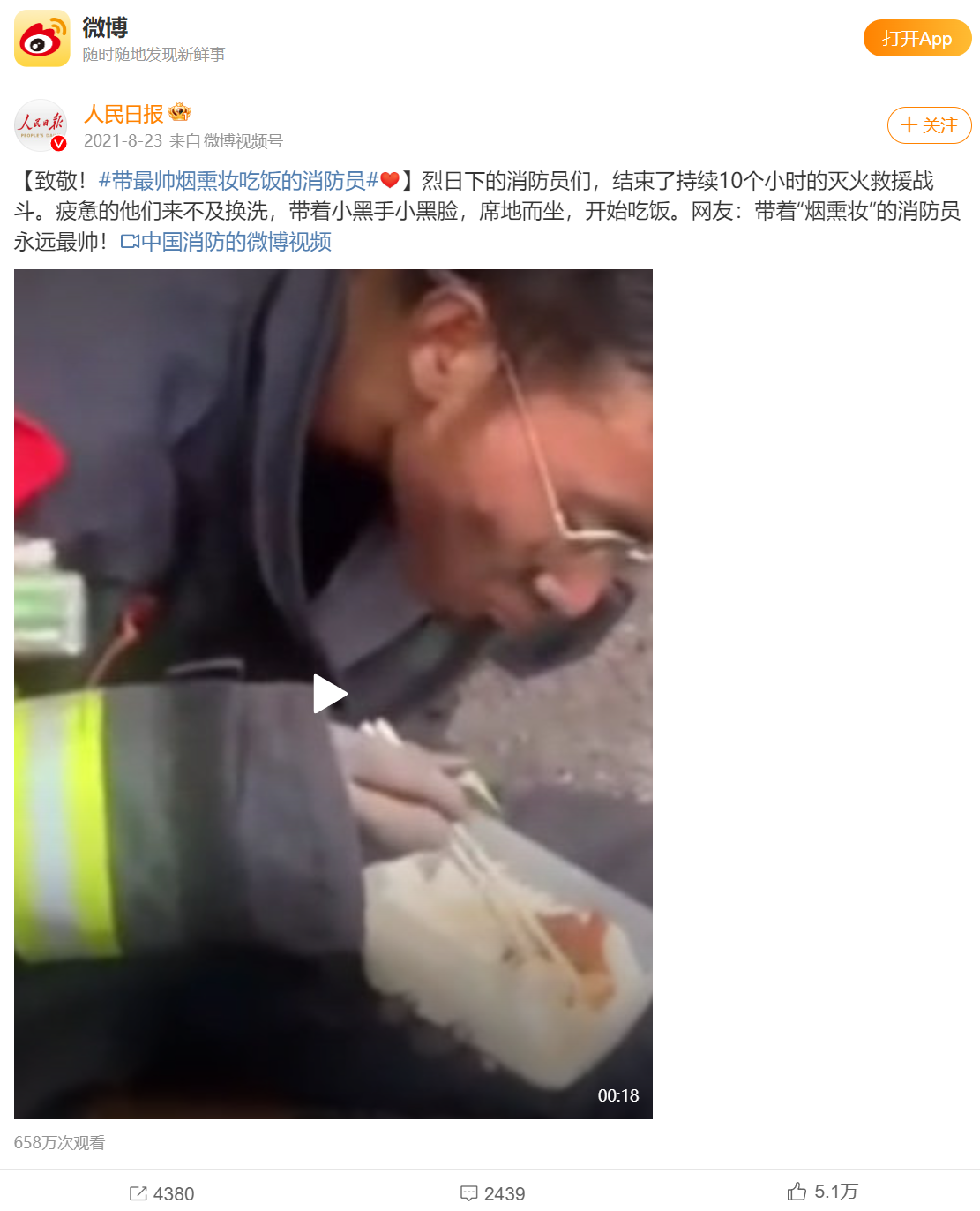 视频一开头带着小黑手小黑脸,大口大口吃着简餐的正是我们的主人公——马韶成。当时,持续10个小时的消防救援行动结束后,他早已是筋疲力尽,饥肠辘辘,来不及换洗便席地而坐就开始吃饭。这个场景恰巧被“中国消防”的官方平台所记录报道,同时也被“人民日报”等多家媒体所转载报道。