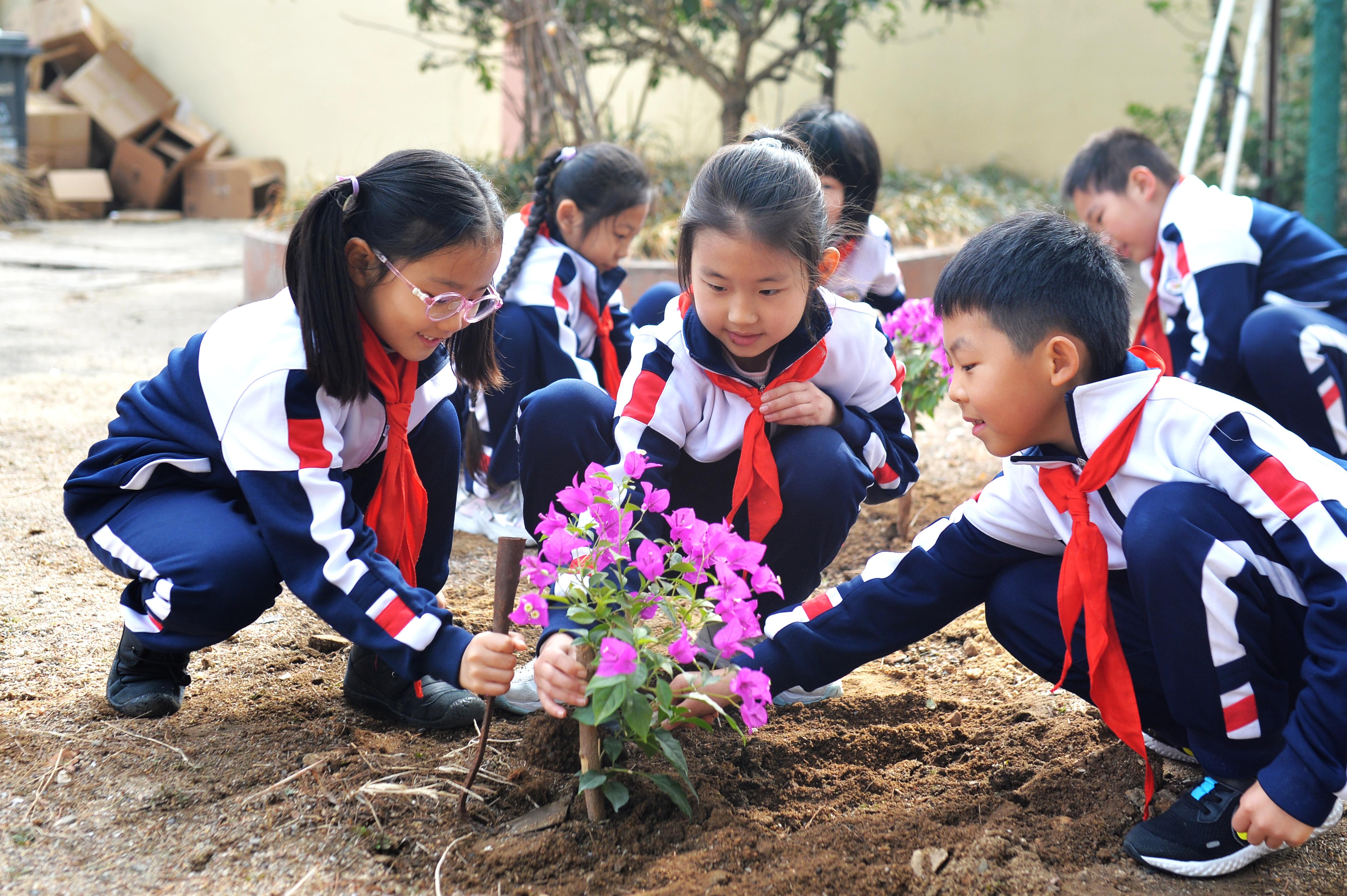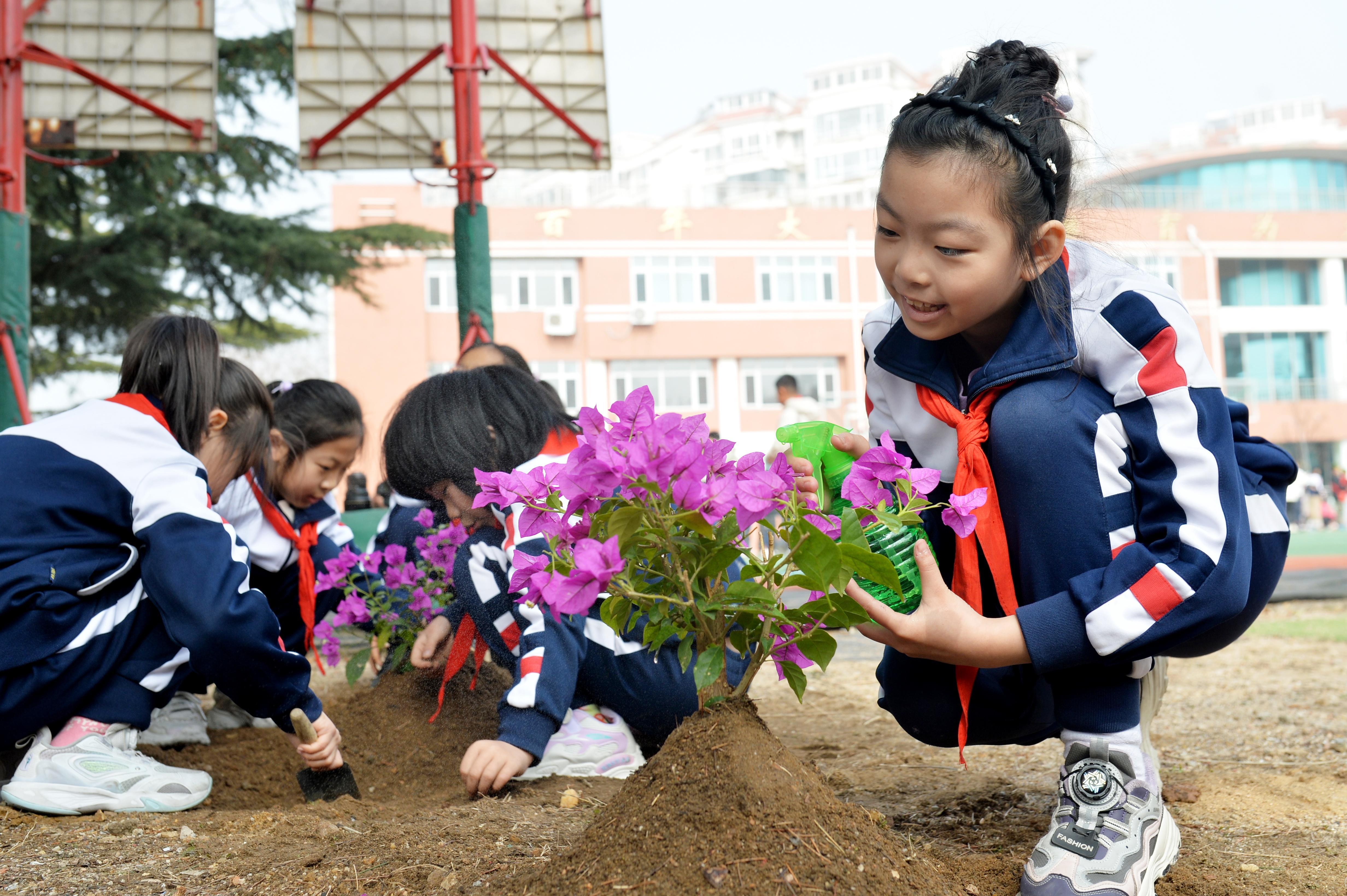 今年3月12日是第47个植树节,山东省青岛市市北区嘉定路小学开展植树添绿活动。学生们一起栽苗浇水,为春天增色添彩,美化校园。