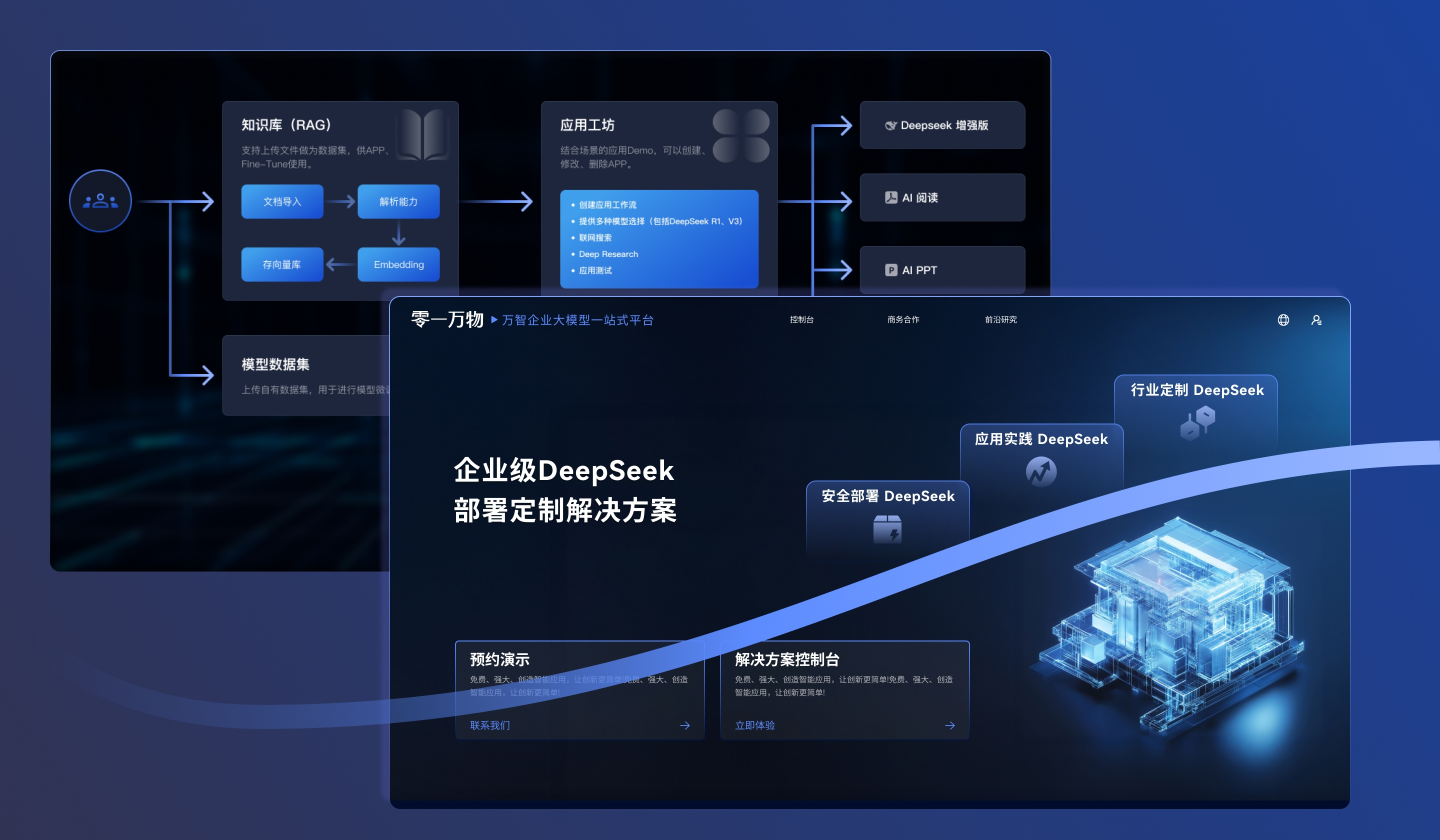 针对现状,自2024年底宣布针对“ToB”智能化转型后,零一万物进一步采取基座模型的开放策略,针对DeepSeek模型私有化专业部署的市场痛点,将全链条技术管线复用到B端的模型私有化部署场景,推出万智企业大模型一站式平台。