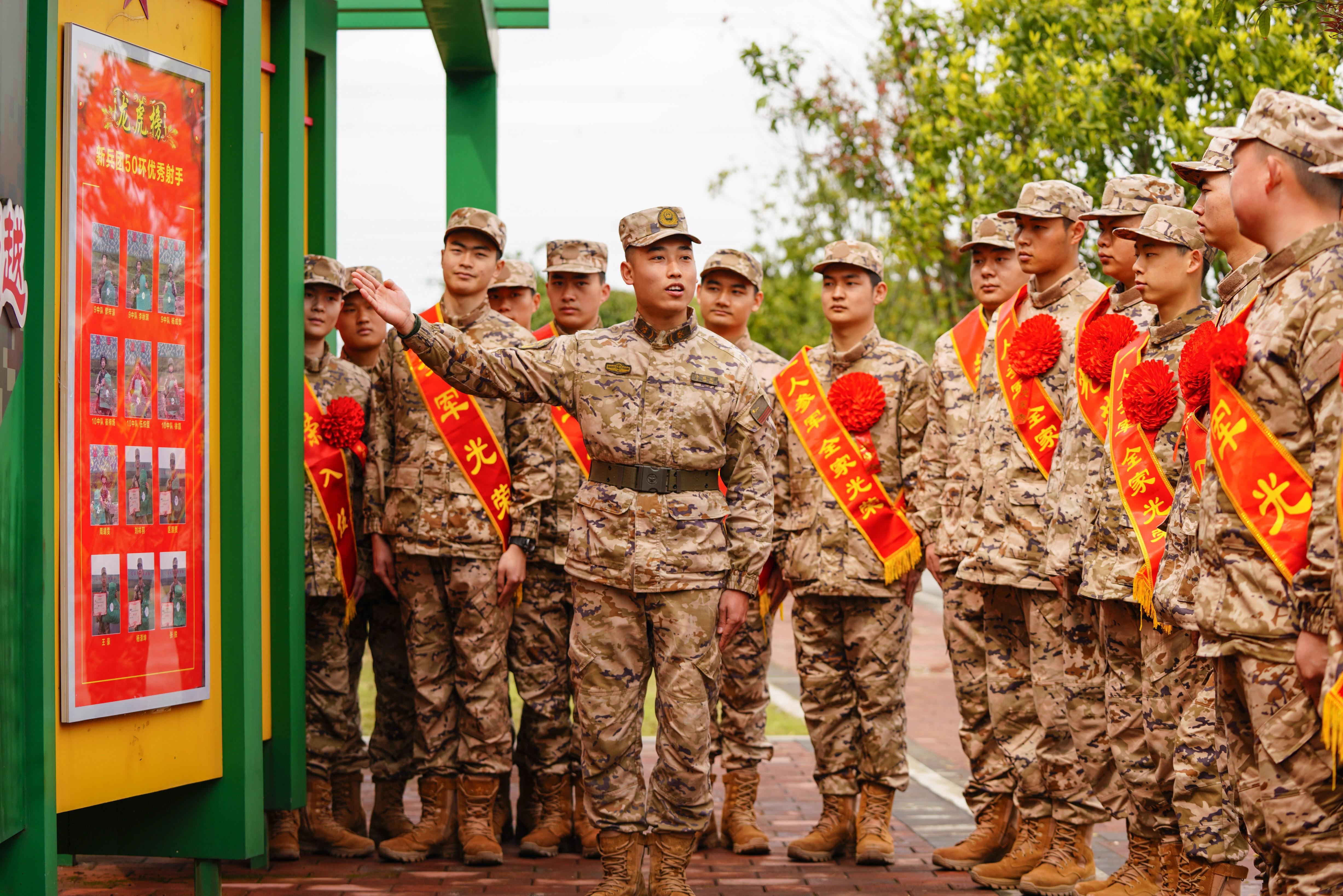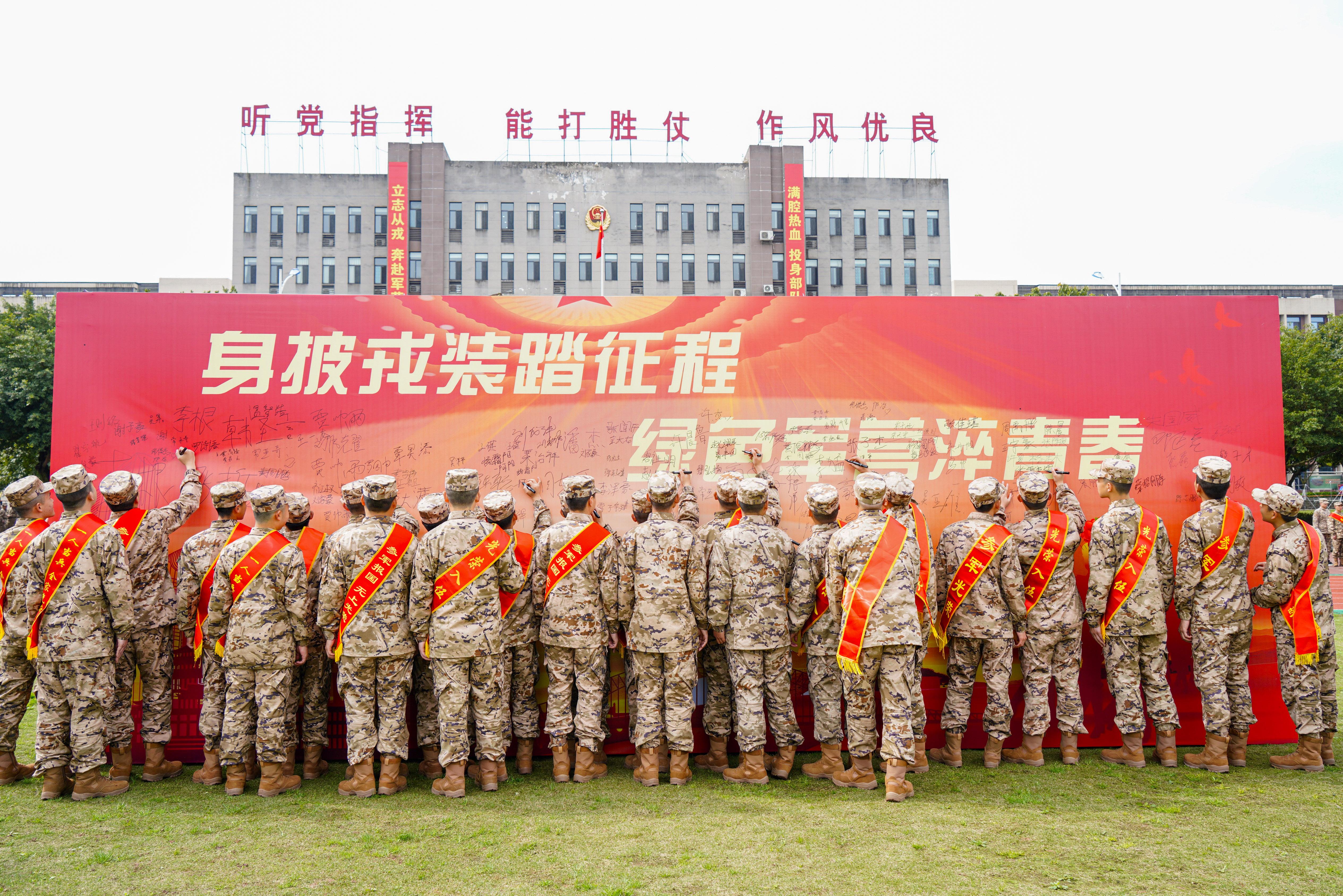 旌旗猎猎迎风展,战鼓声声震云霄。满载新战友的车辆缓缓驶入营区,新兵团首长和全体新训干部骨干整齐列队、夹道欢迎,新训班长热情接过新兵的背包和行李,迎接新战友的到来。在经过物资点验、健康筛查、档案交接等程序后,各班班长带领新兵来到“身披戎装踏征程 绿色军营淬青春”的签名墙前,进行签名仪式和拍照打卡活动,引导新战友迈好军旅第一步,积极投身强军兴军伟大实践。