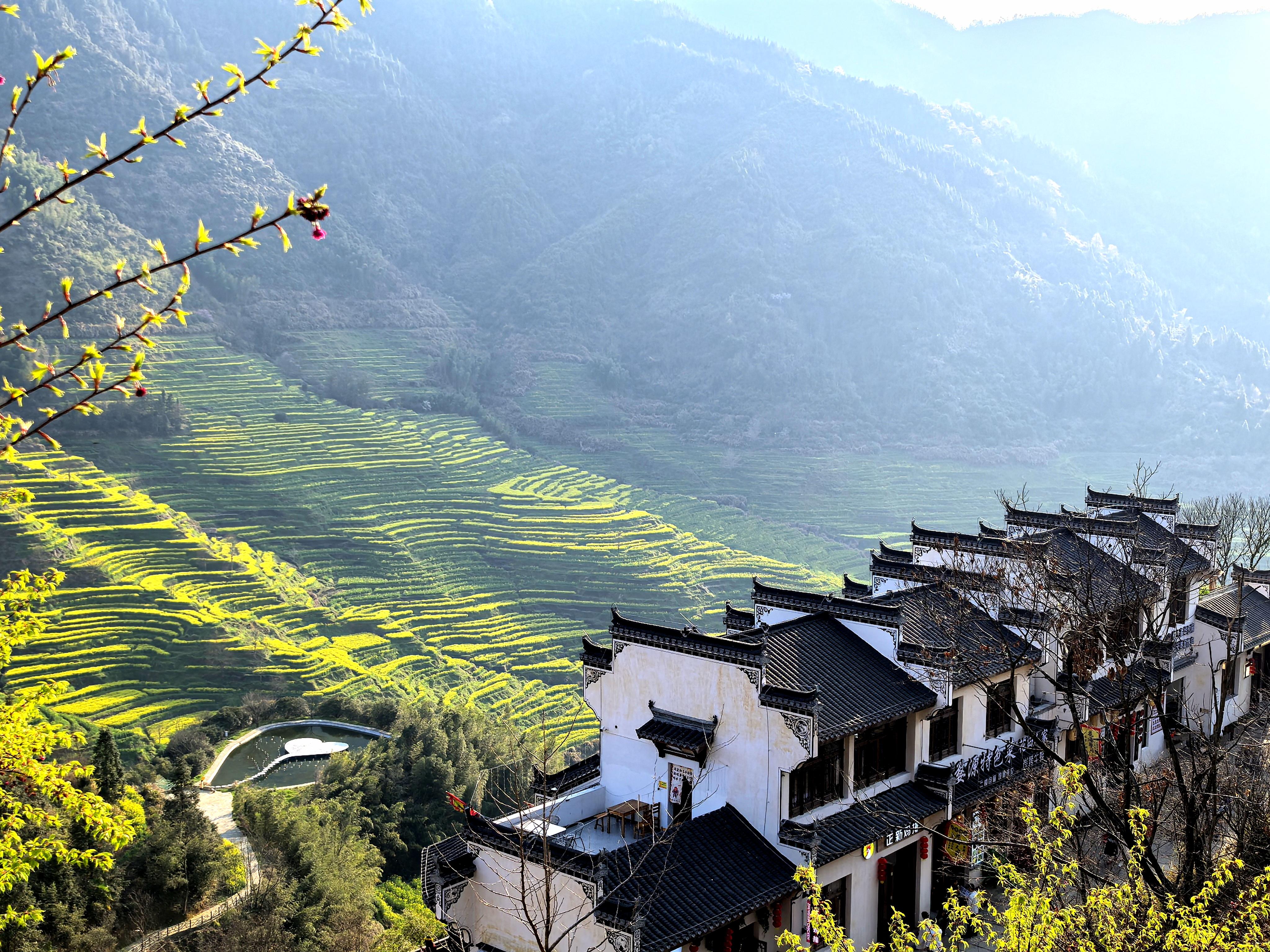 如今篁岭一期古村梯田花海正处于最佳观赏期,重叠有序的油菜花在梯田绽放,摇曳出金色波浪,美得如诗如画。