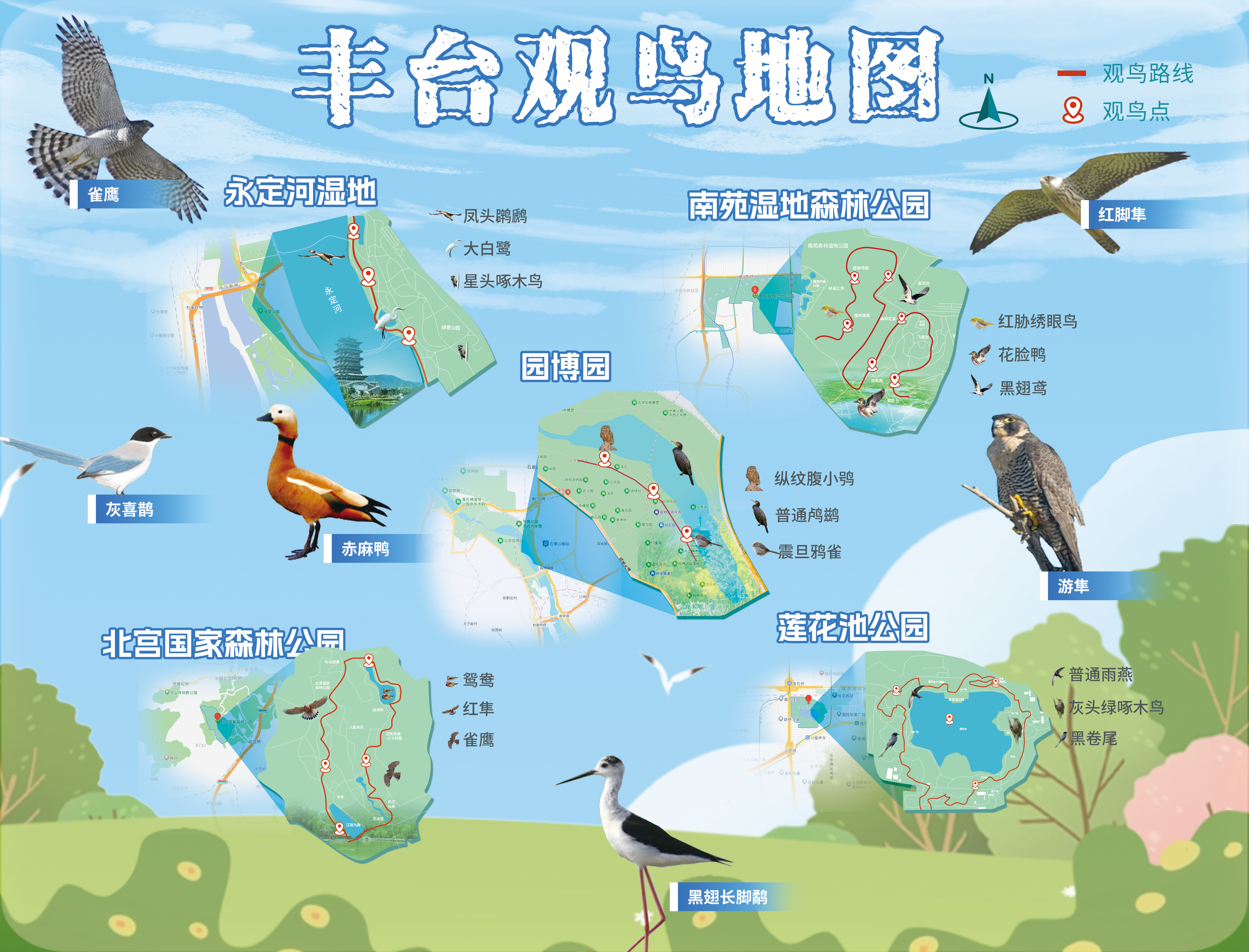 “丰台观鸟地图”则是由南苑森林湿地公园、莲花池公园、永定河畔的绿堤郊野公园、北京园博园、北宫国家森林公园五大公园串联起来,全年可邂逅红隼、雀鹰等百余种鸟类。