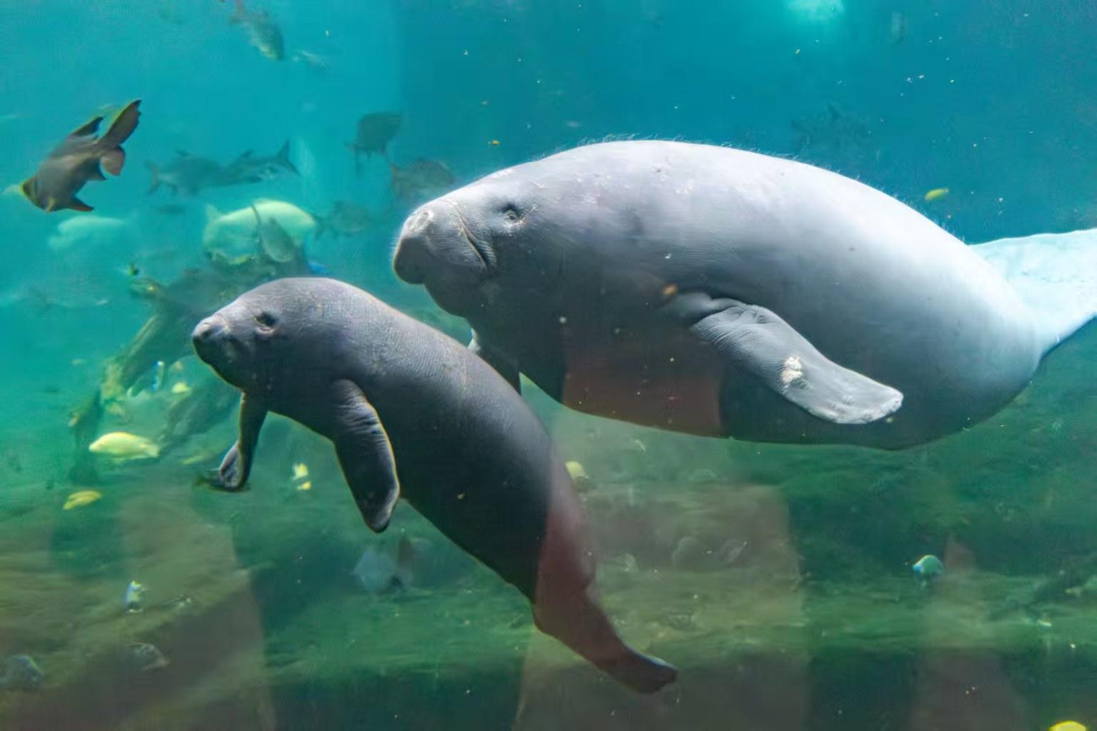 在海牛馆内,已满月的小海牛贴着妈妈缓慢游动,母女约10倍的“最萌”体重差,吸引众多游客驻足观看。小海牛时而趴到妈妈背上“搭便车”,时而在妈妈身侧共游,时而浮到水面呼吸空气,时而蹭在妈妈“胳肢窝”下喝奶,十分活泼。