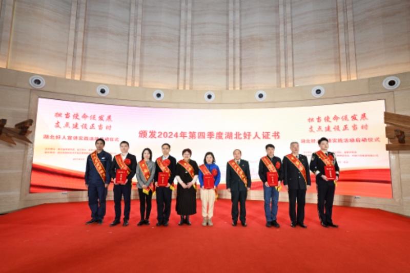 仪式现场发布了2024年第四季度湖北好人名单。他们扎根平凡岗位、守护人间烟火,用善行和义举诠释“伟大出自平凡”,让向上向善的文明基因深植湖北沃土。中国好人鲁素珍、沈胜文、张龙和湖北省道德模范胡洪炜、熊桂林,共同为2024年第四季度湖北好人代表潘黎、赵刚、田燕、陈军、杨波颁发湖北好人证书。