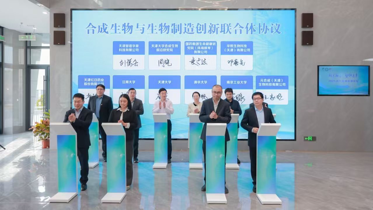 与此同时,武清区“AI+合成生物”产业联合体正式成立,天津大学合成生物前沿研究院与多家企业、投资机构现场签约。其中包括与AI大模型企业智谱华章签订战略合作协议,双方共同开发AI在合成生物领域如基因设计、菌种构建、蛋白结构设计的垂直应用软件;与国药集团生命健康研究院(珠海横琴)签订合作框架协议,将研究院生物制造技术成果赋能大健康产业;浙江天化、河北恒华盛世环保、天津优达产投,与研究院签订了投资意向协议,助力研究院在香精香料、食品、医美等领域的生物制造企业孵化;研究院与华熙生物、红日药业、国药集团生命健康研究院(珠海横琴)、元合成、智谱华章,及清华大学、天津大学、江南大学、南京工业大学等高校共同签订“合成生物与生物制造创新联合体”,在生物制造上开展产学研紧密合作。