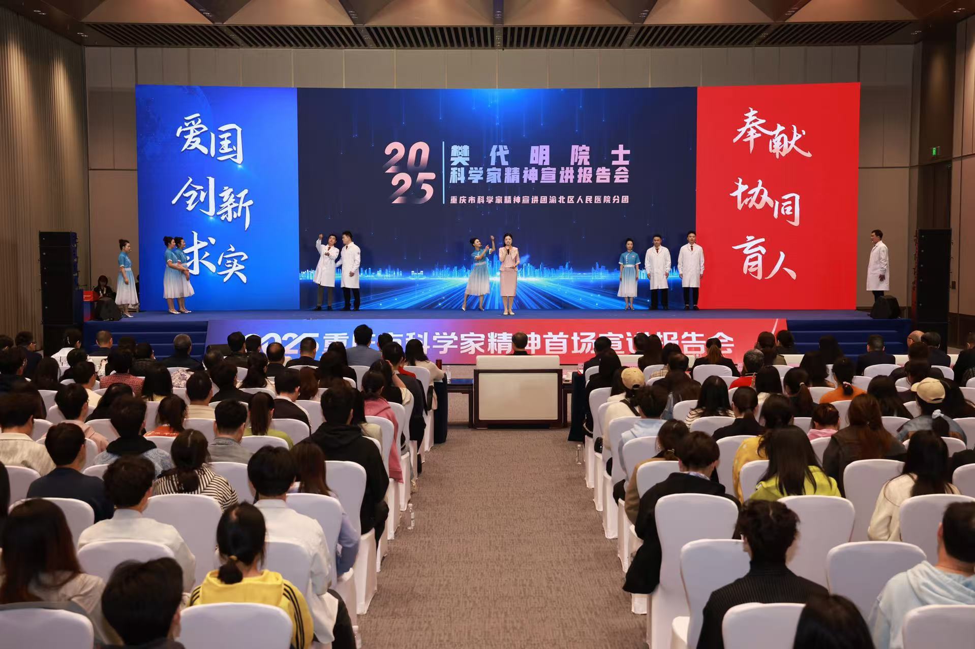 宣讲报告会上,来自渝北区人民医院宣讲分团的6位宣讲人以情景演绎方式,分别从求学之路、名医之路、园丁之路、院士之路、乡情之路等5个篇章,生动讲述了重庆籍中国工程院院士樊代明的成长历程和感人事迹,深刻阐释了“爱国、创新、求实、奉献、协同、育人”的科学家精神。