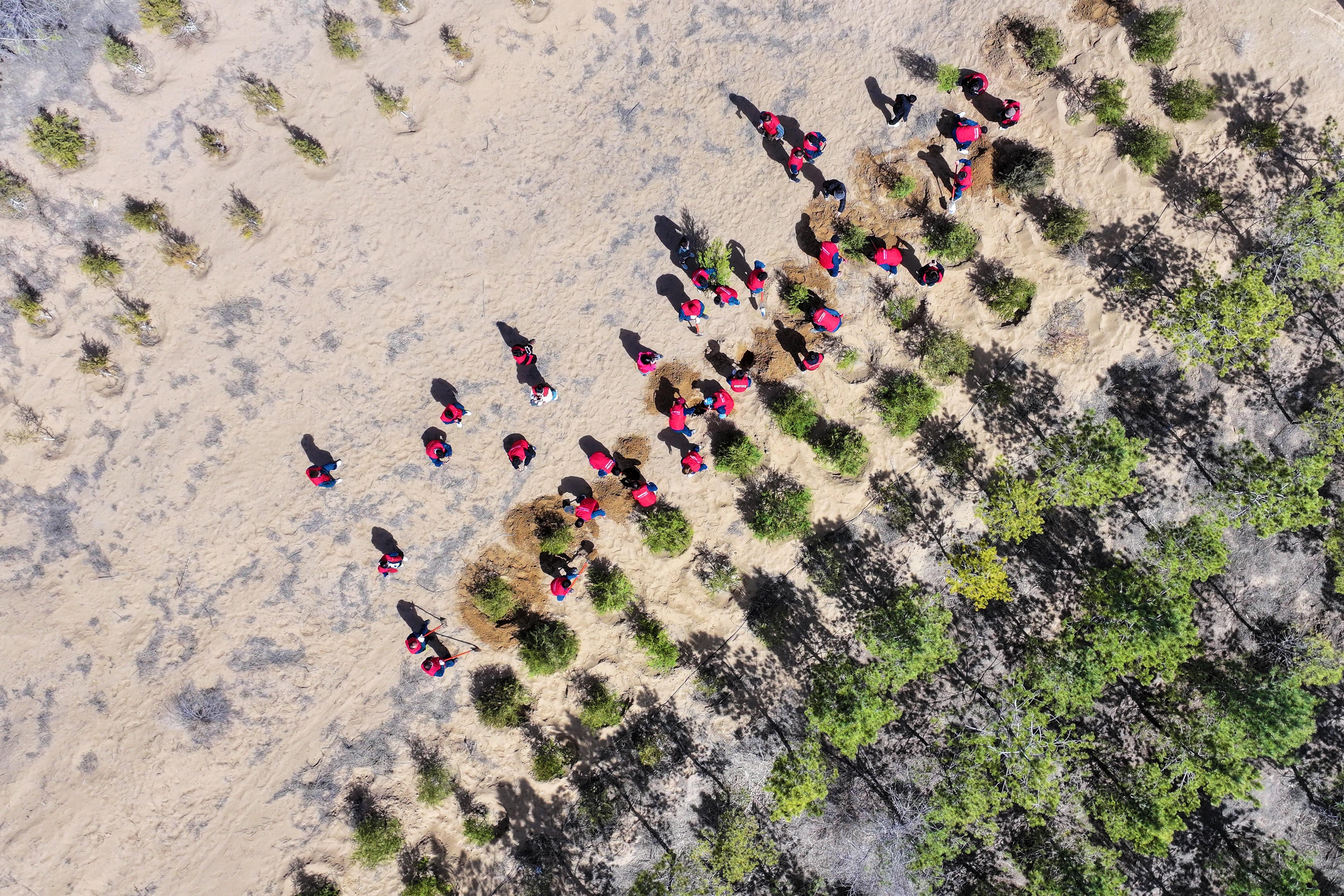 “侧柏耐旱耐寒,是固沙造林的优势树种,栽种时要注意根系舒展、覆土压实。”技术人员一边示范一边讲解。在学习了栽种侧柏的技术要领后,党员服务队队员们三两一组,挥锹铲土、扶苗培土,严格按照技术规范栽种每一株侧柏树苗,让点滴绿色成为沙地中最亮丽的底色。