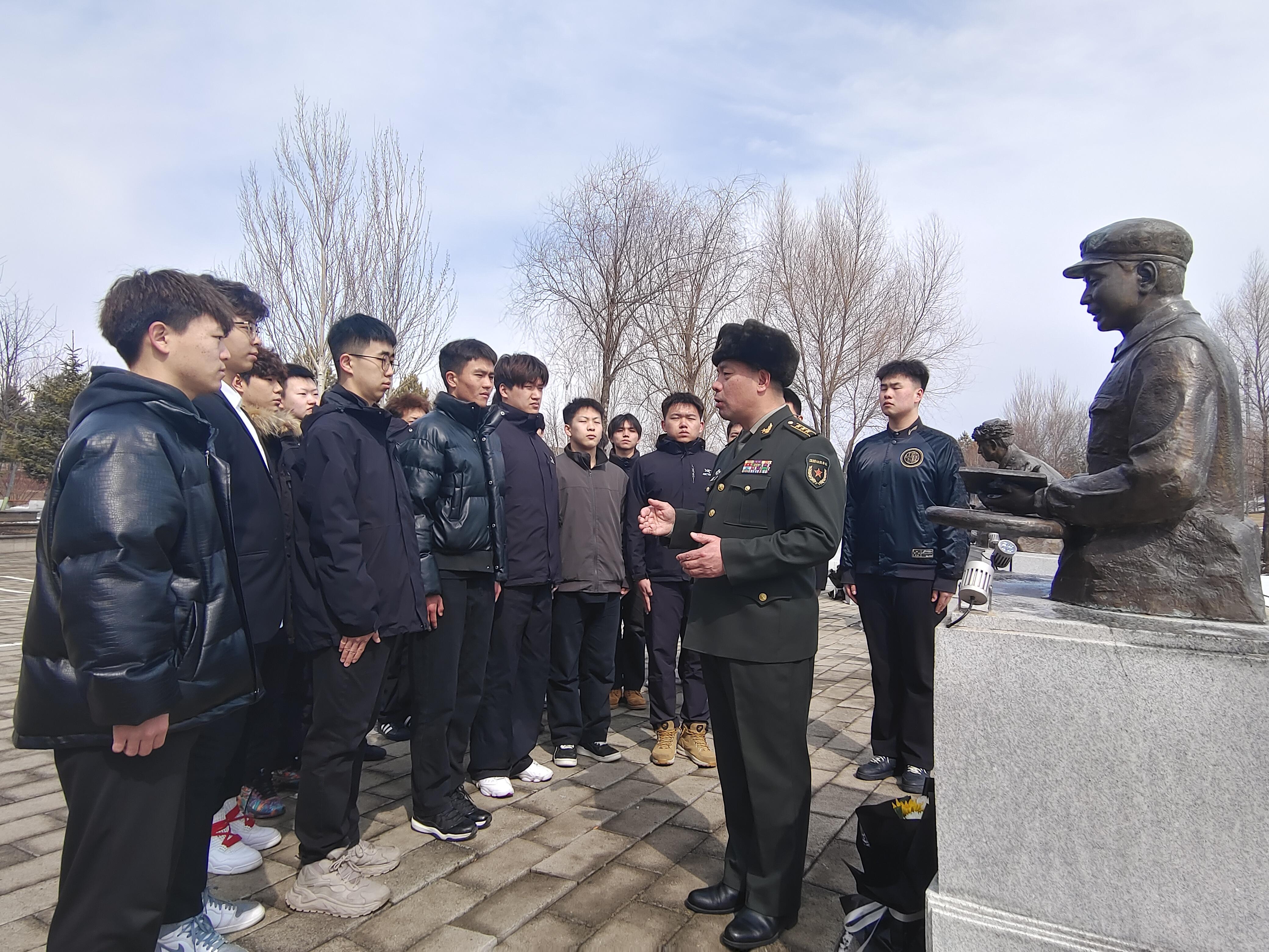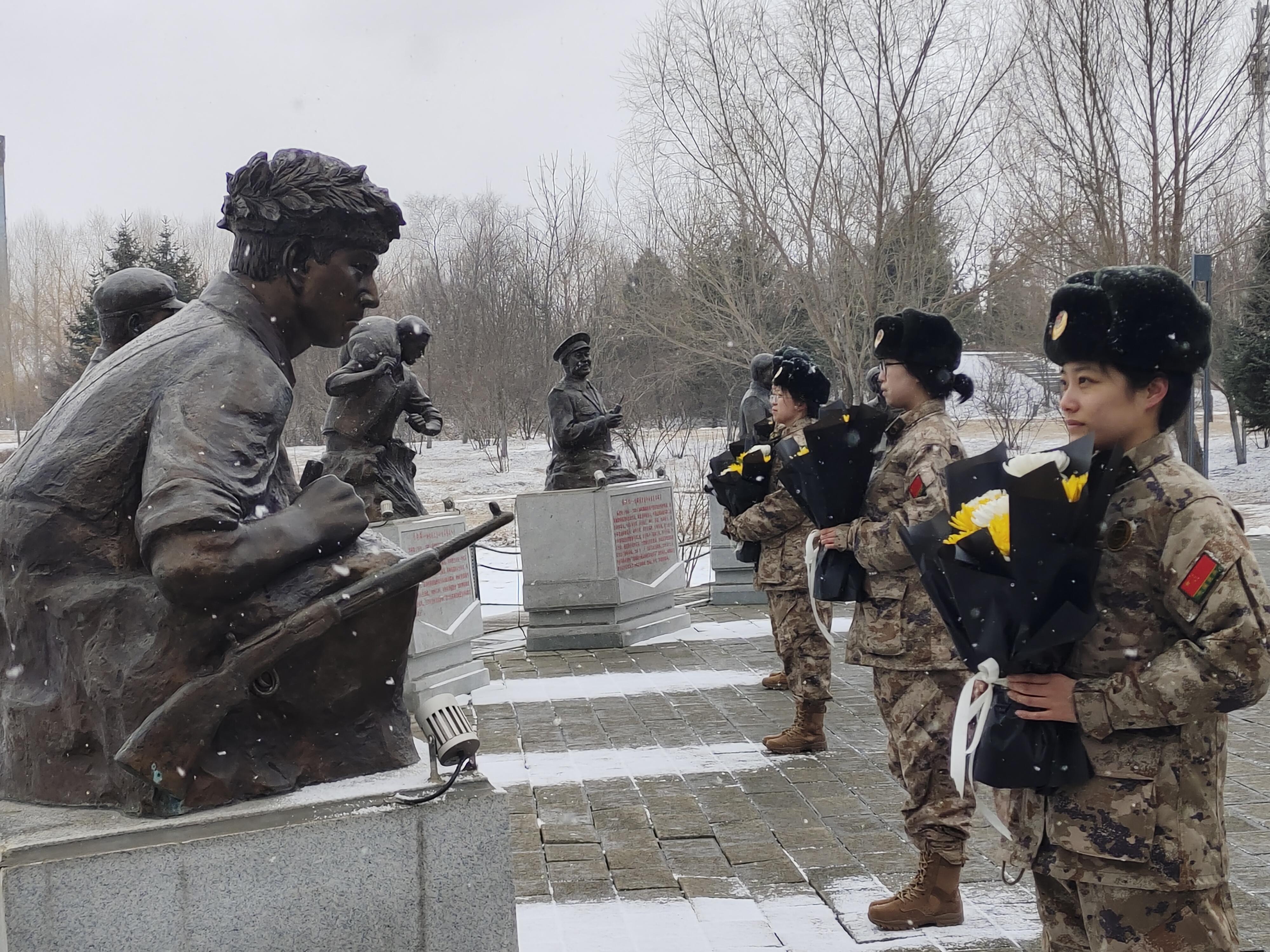 3月28日上午的哈尔滨气温依然低至-7℃,并不时飘起像柳絮一样纷纷扬扬的雪花。面对张思德、董存瑞、黄继光、邱少云、雷锋、苏宁、李向群、杨业功、林俊德、张超10位全军挂像英模的雕塑,全体人员庄严肃立,依次完成了擦拭雕塑、敬献鲜花、全体默哀、代表致辞等祭奠环节。