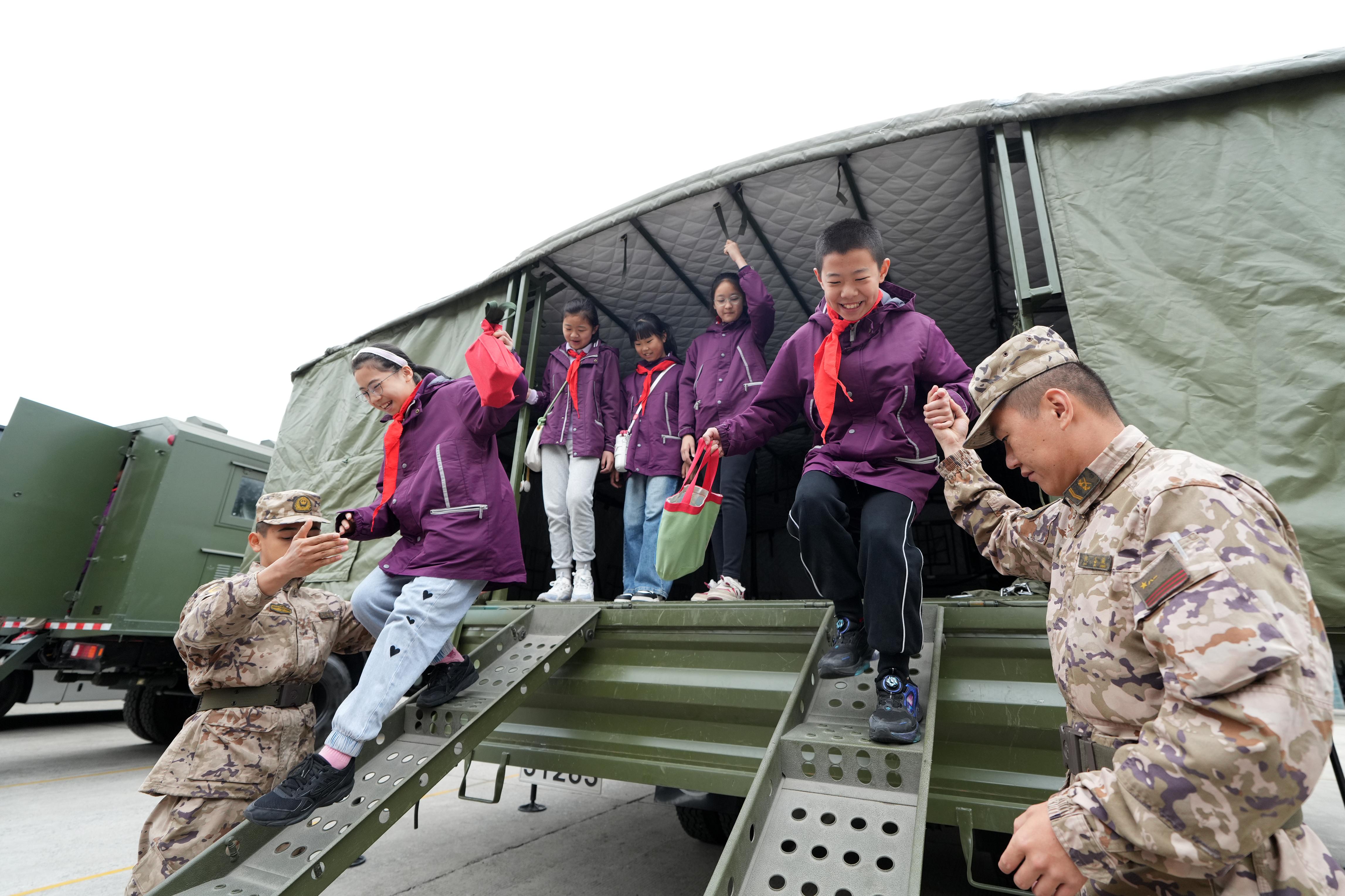 武警福州支队机动大队训练场上,一辆辆特种车辆整齐排列。在官兵们的引导下,福州市鼓楼第一中心小学的200余名师生分批登上宿营车、野战文化车等军用车辆。