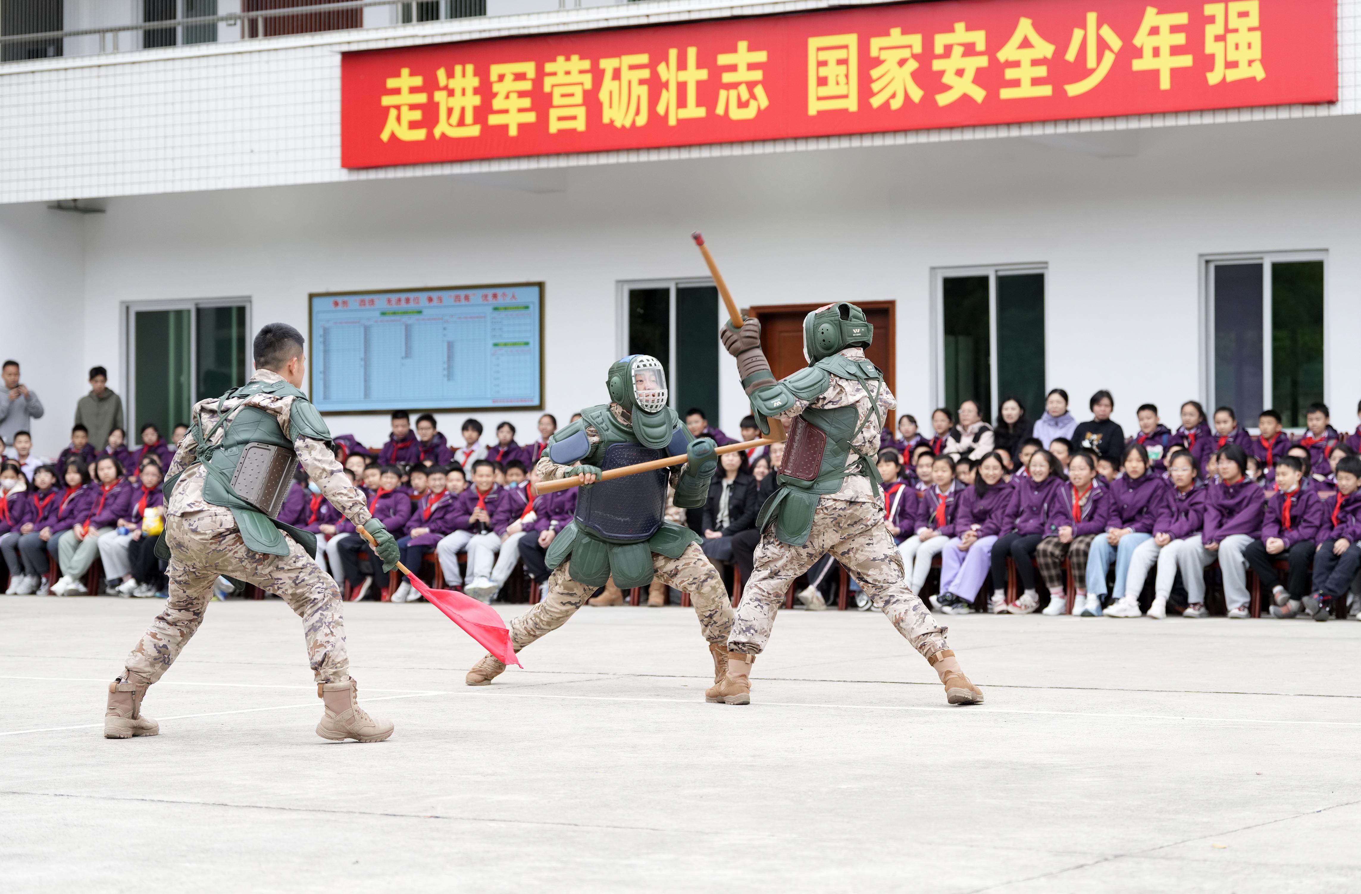 在擒敌拳、刺杀基本动作展示中,特战队员拳法迅猛如电,刺杀动作精准有力,“杀”声震耳。现场两百余名小学生目不转睛,不时爆发出热烈掌声。来自五年级8班的同学黄译平激动说道:“武警叔叔太帅了,他们有严格的纪律和秩序,天天训练,保护我们,长大了我也想成为军人,保护更多的人。”