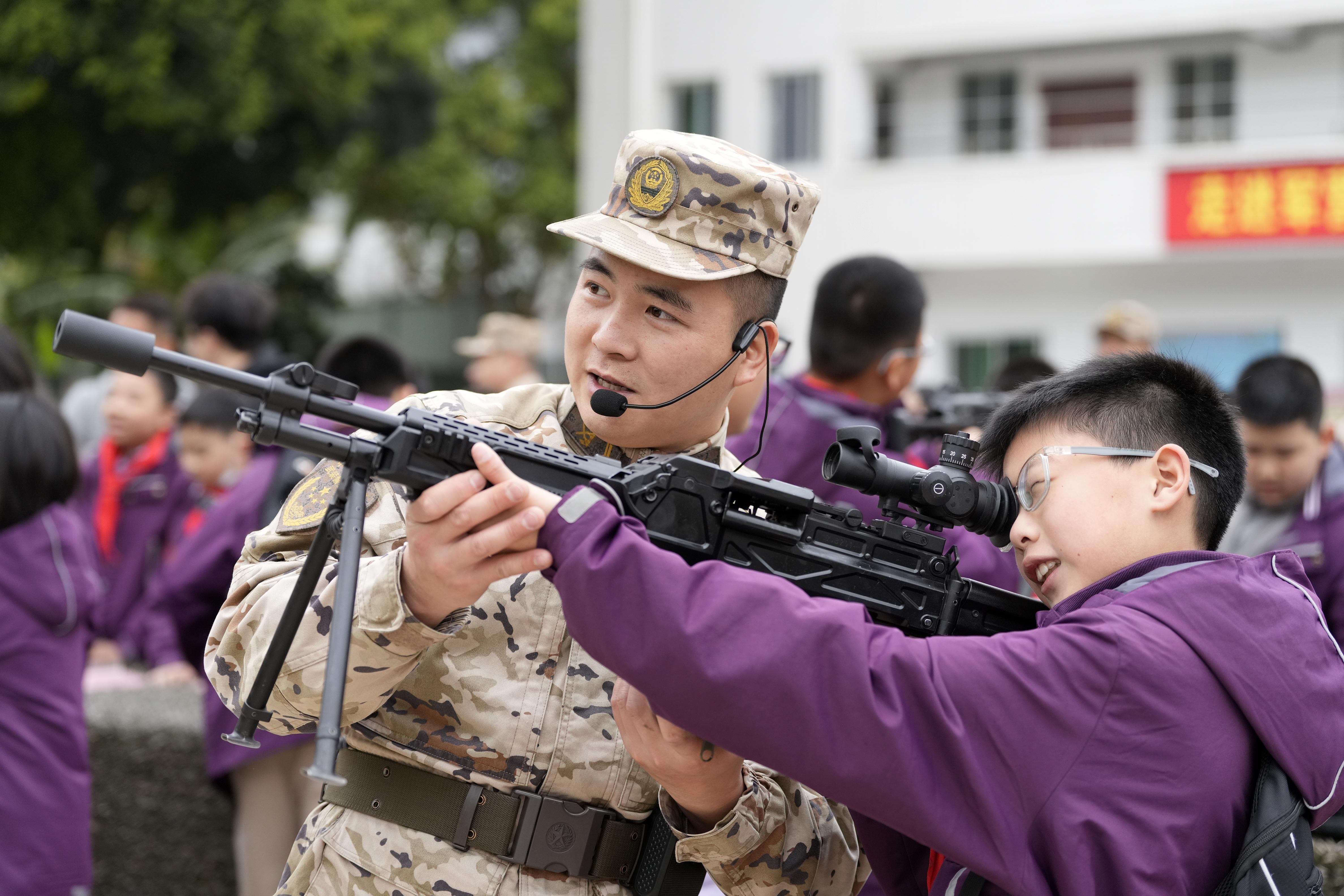 在特种装备展示环节,特战队员向师生逐一介绍特种装备的功能和基本操作方法,在官兵们手把手的指导下,学生们认真学习据枪、瞄准等动作,亲身体验军事装备的魅力。五年级5班的吴佳橦兴奋地说:“摸到真正的狙击步枪特别激动!武警叔叔教我们‘三点一线’瞄准方法,枪托抵肩时感觉整个身子都在抖。现在知道军人叔叔每天要扛这么多装备训练,特别佩服他们。”