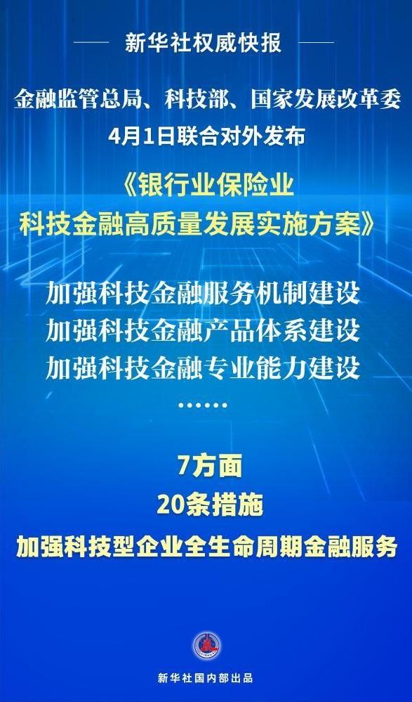 金融监管总局、科技部、国家发展改革委4月1日联合对外发布《银行业保险业科技金融高质量发展实施方案》,从加强科技金融服务机制、产品体系、专业能力和风控能力建设等7方面提出20条措施。