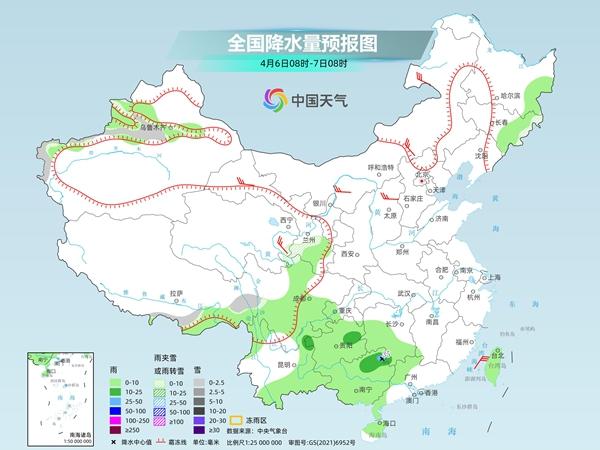 后天,新疆沿天山地区和南疆西部山区、甘肃南部、吉林东部等地部分地区有小雪或雨夹雪。湖南南部和西部、西南地区大部、广西、广东西部等地部分地区有小到中雨,其中,广西东北部局地有大雨。