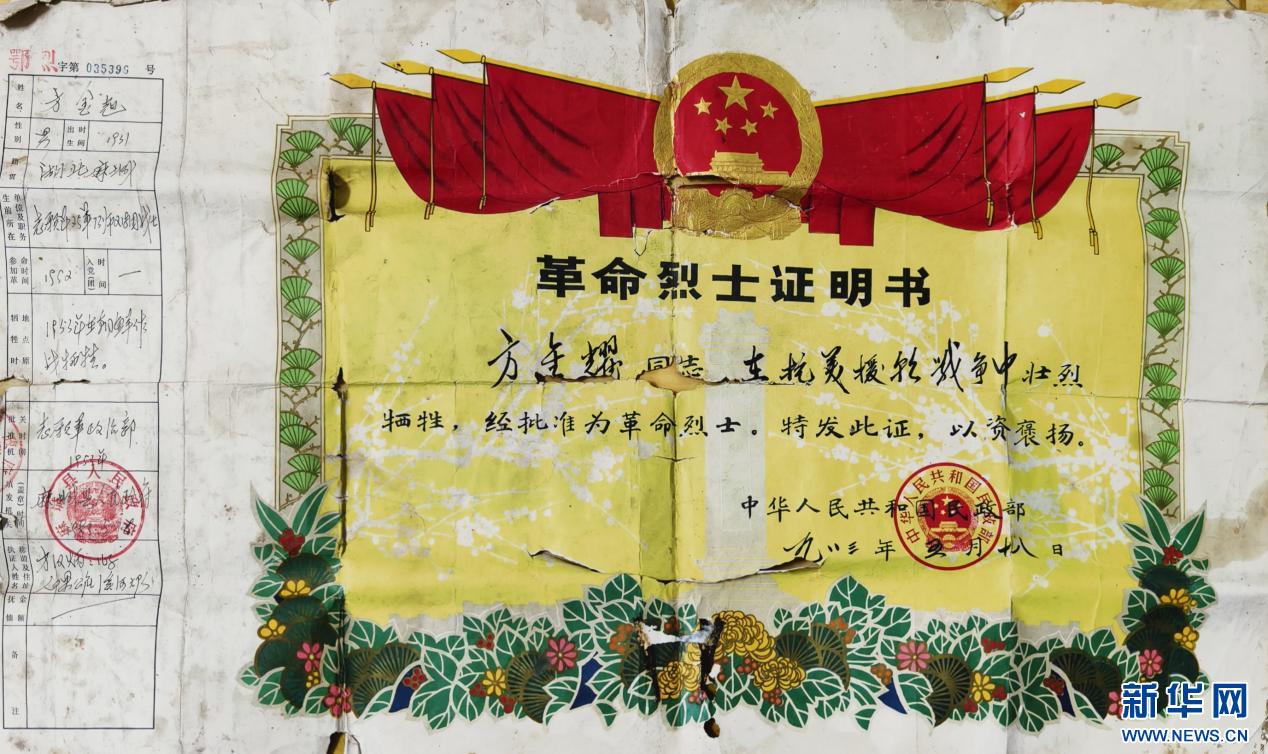 3年后,一张烈士证和一面光荣牌被送到了家里。“父亲是家中独子,生前没有留下任何画像和照片。”方汉炳回忆说,每年清明节,他只能向着北方,给父亲磕头上香。