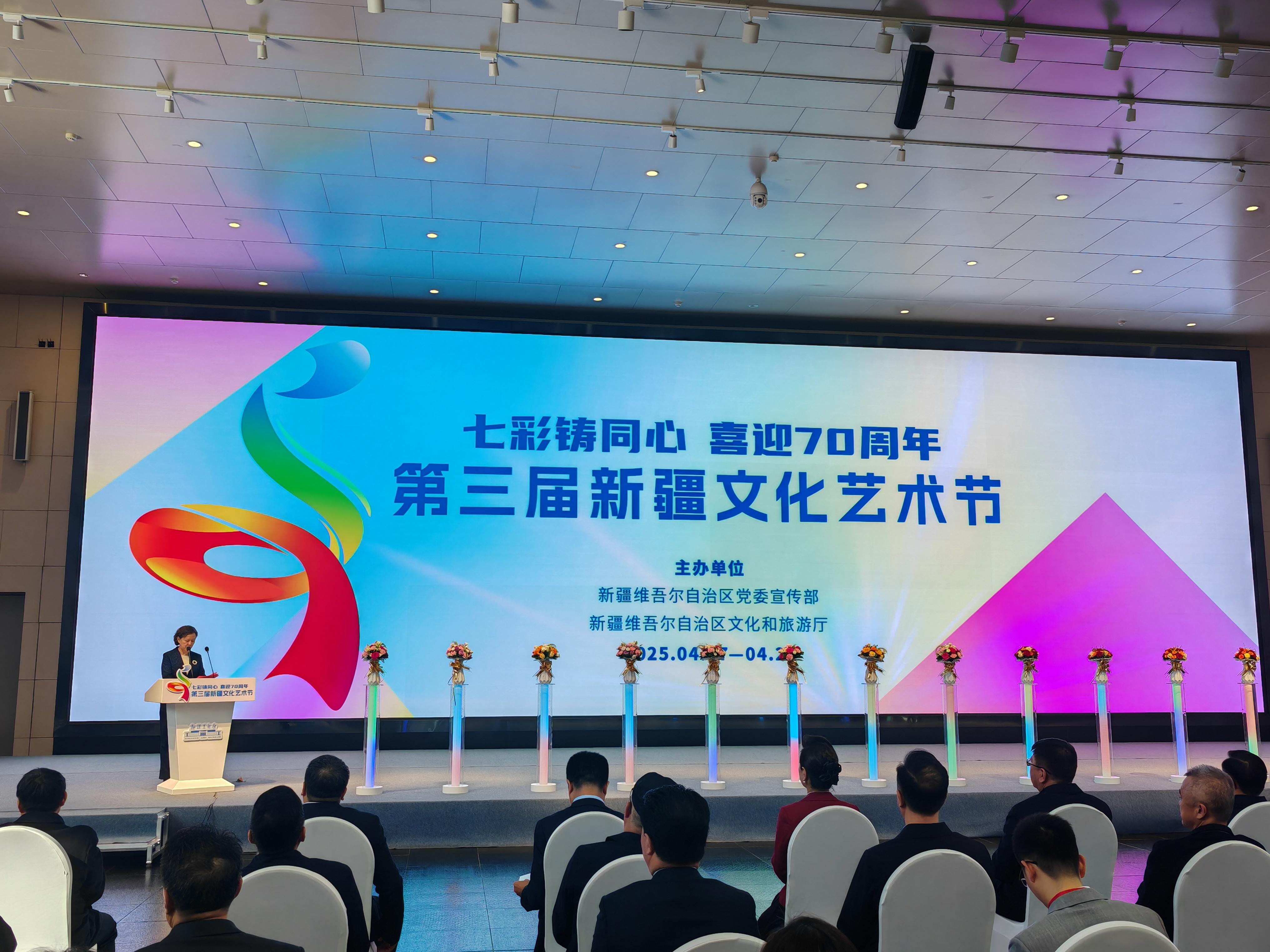 4月7日,第三届新疆文化艺术节开幕式暨第五届新疆油画展在乌鲁木齐举行。本届文化艺术节以“七彩铸同心 喜迎70周年”为主题,在近半个月时间里,集中推出37部优秀舞台剧目展演、7场精品艺术展览,并同步举办小剧场演出、街舞展演等系列配套活动,以及举办144项群众文化活动,突出“全民参与、全民共享”。