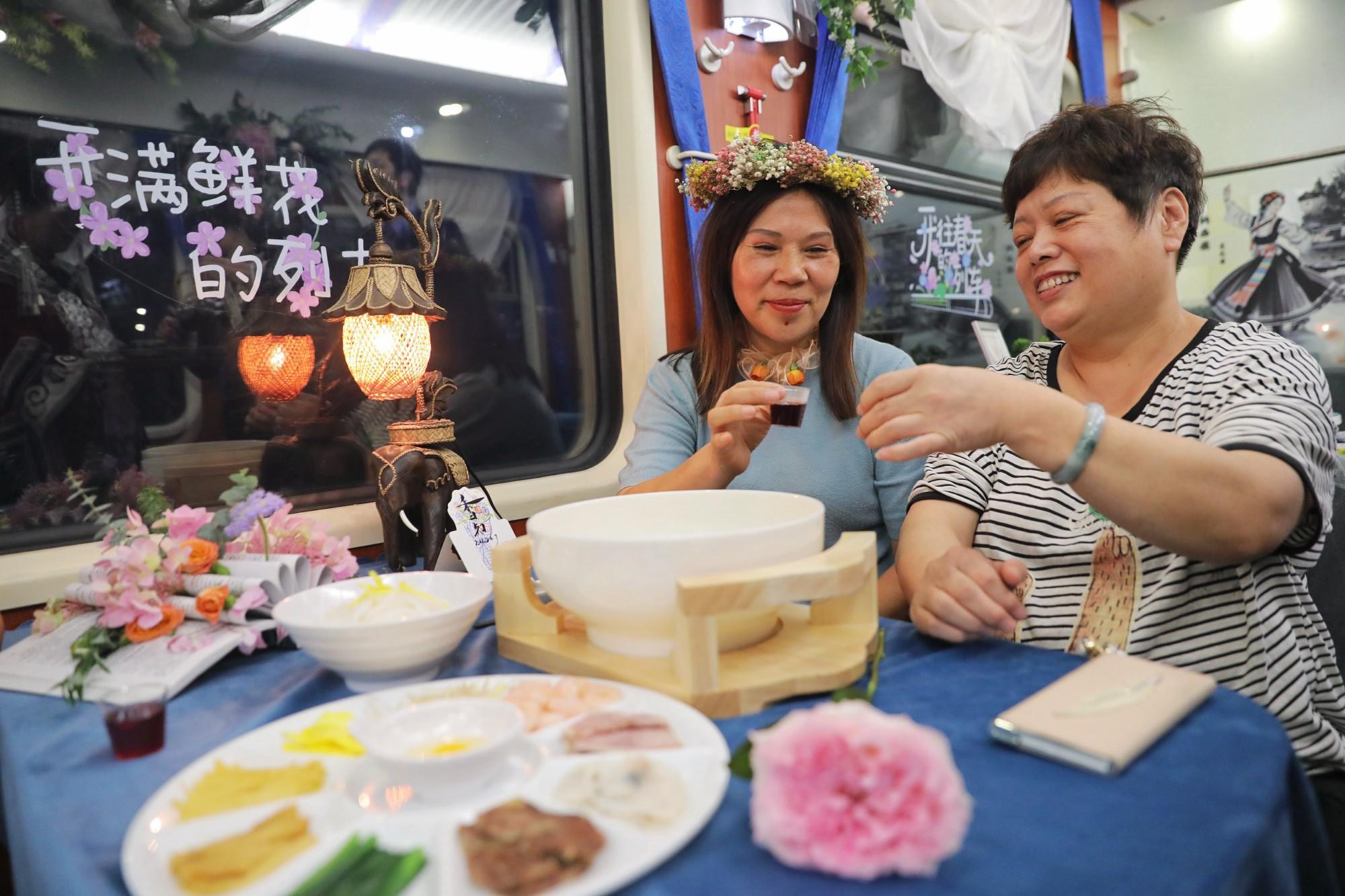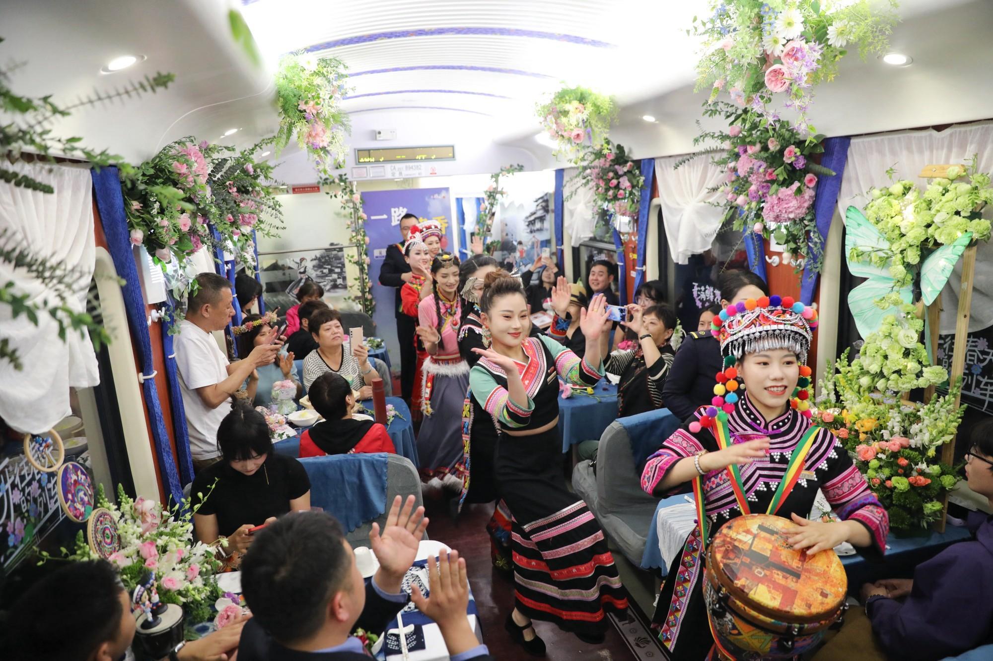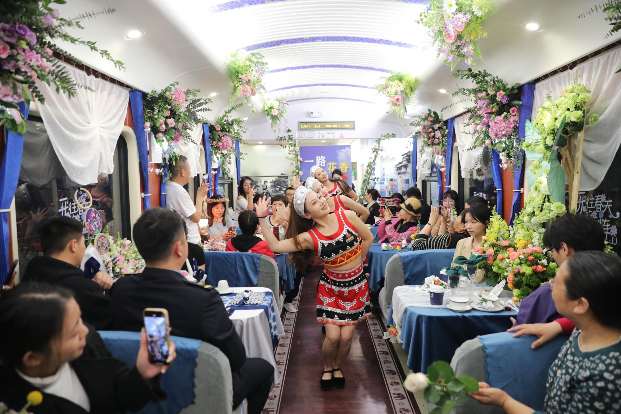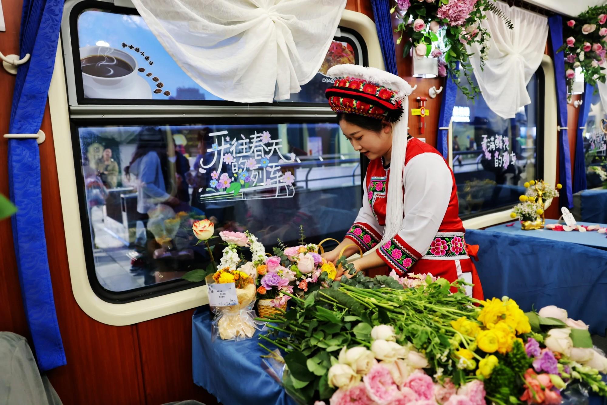 除视觉享受外,列车提供丰富的文化体验:旅客可品尝鲜花酥、鲜花饼等特色美食,感受花香与菜香的融合;在花艺台体验插花乐趣,亲手创作插花作品;通过“云花伴旅”服务,在乘务员协助下编制花卉头绳,或通过“昆铁+”小程序购买云南花卉产品,将美好带回家。